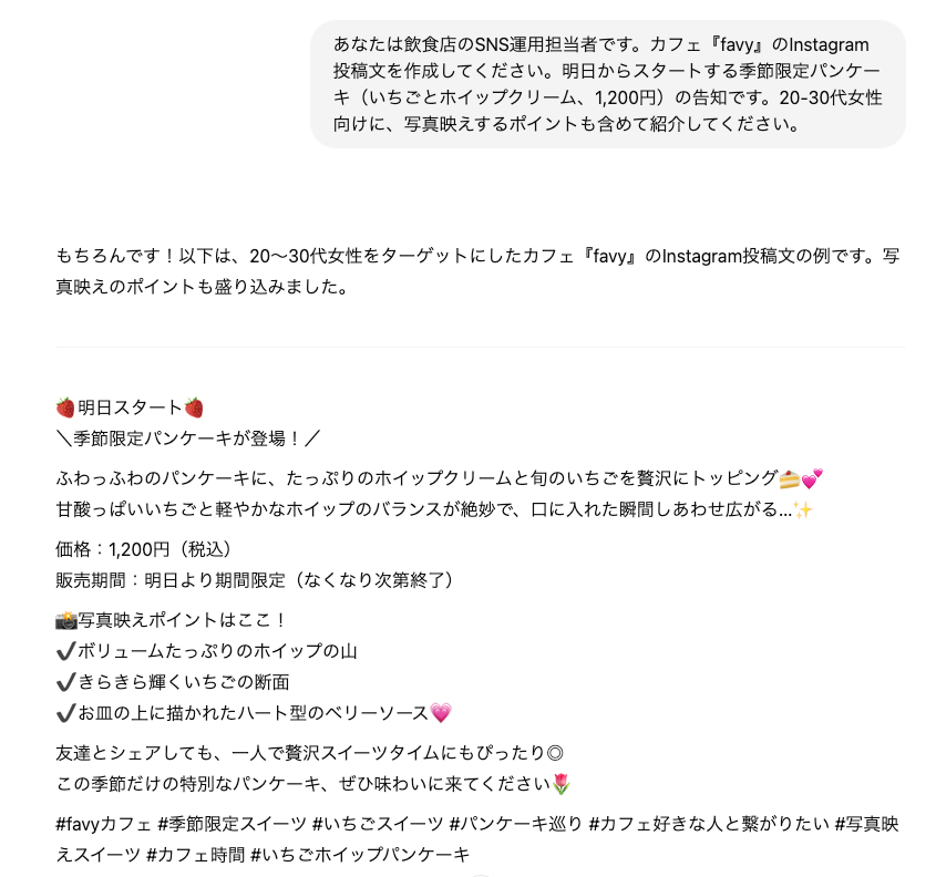 時間と労力の大幅な削減 SNSの投稿文作成にかかる時間を大幅に短縮できます。特に飲食店では日々の業務が忙しく、投稿文の作成に時間を割くことが難しいですが、ChatGPTを活用することで、数分で魅力的な投稿文が完成します。