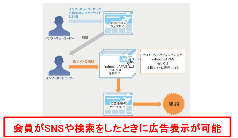 リターゲティング広告とは? 一度Webサイトに来訪したユーザーへ広告を表示させることができるWeb広告。 Webサイトに来訪した人は、そのWebサイトに掲載されている商品やサービスに興味関心を持っている可能性が高く、リターゲティング広告はそのユーザーに直接アプローチすることができます。