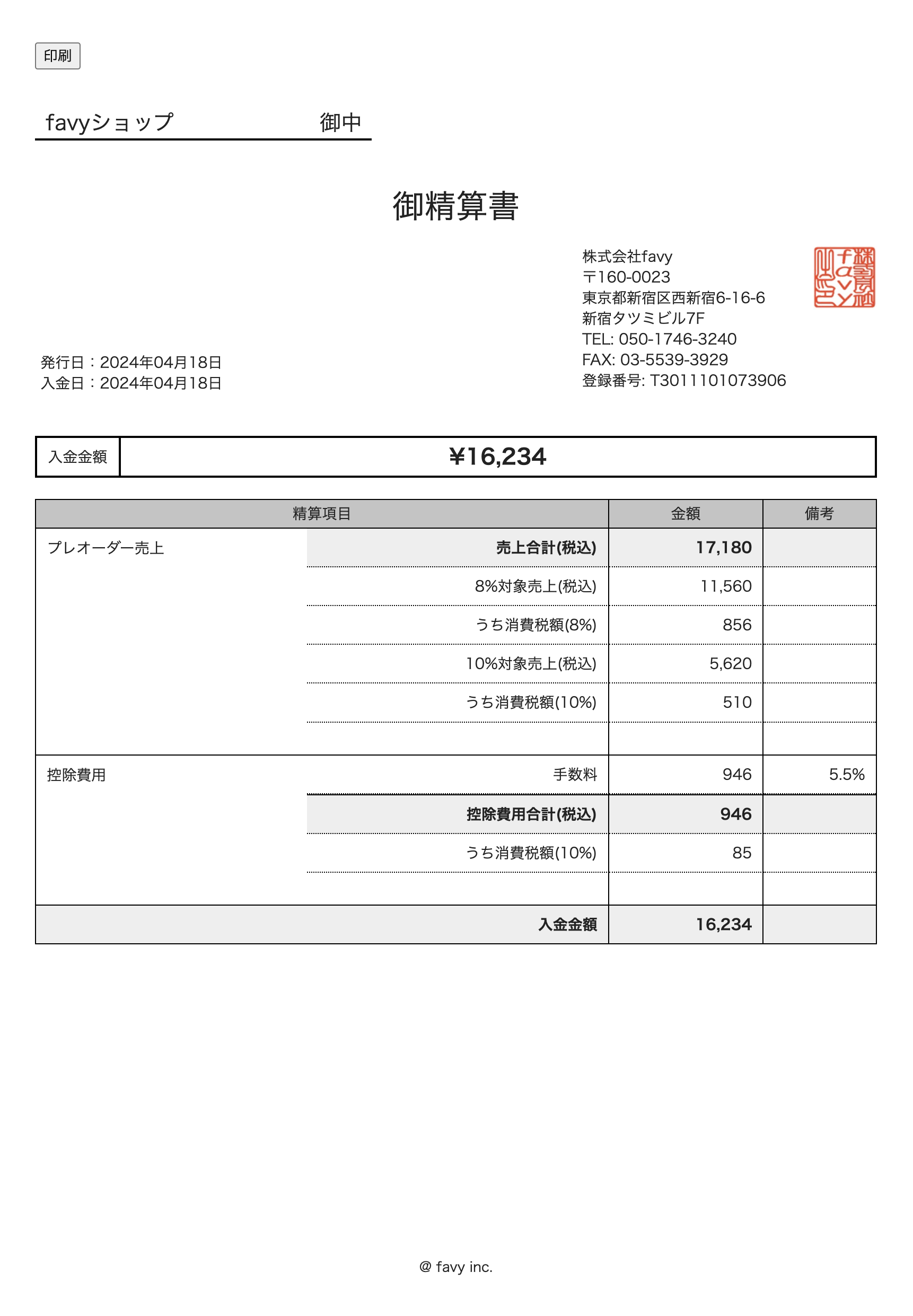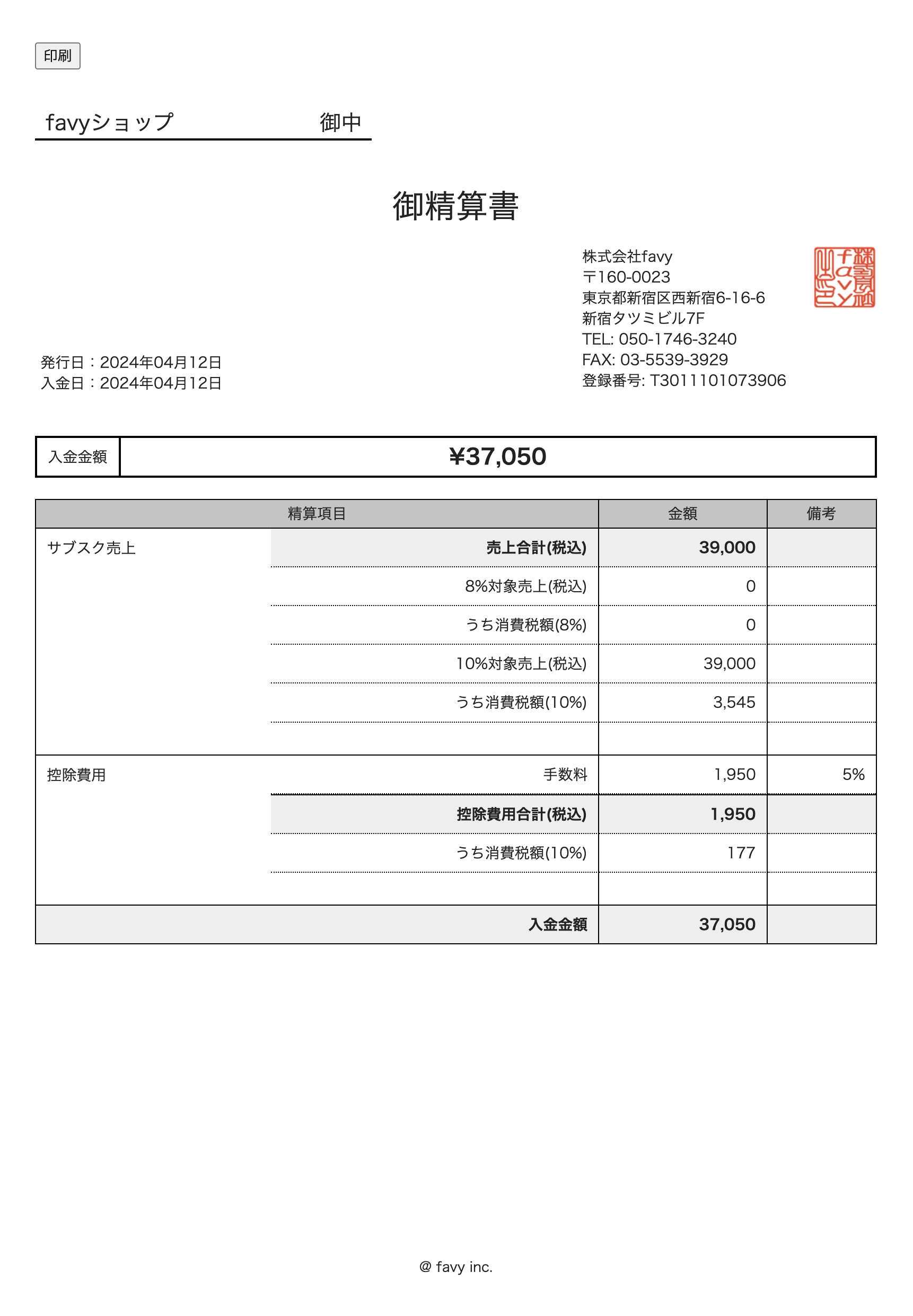 favyサブスク・favyモバイルオーダー:事前決済の、店舗管理画面における入金明細書(精算書)をインボイス対応します。