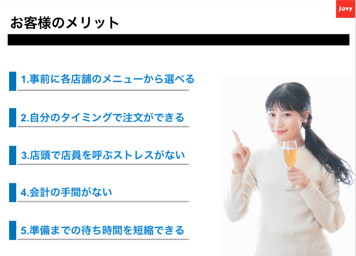 プレオーダーにより集まるデータを分析することで、人気のあるメニューやドリンクなど、メニュー改善に役立てることができます。