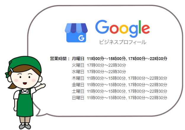 営業時間を設定することで、お客様はお店がいつ営業しているかを簡単に確認できます。