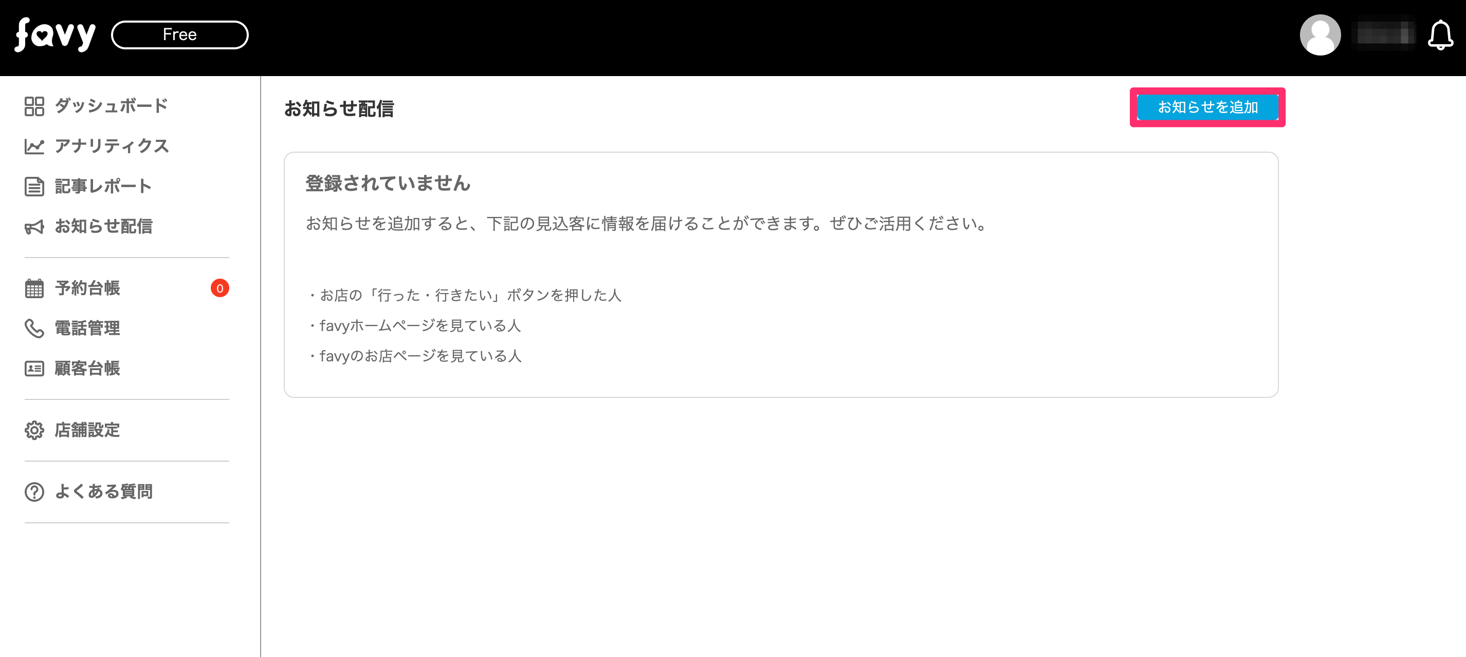 「お知らせを追加」をクリックする。