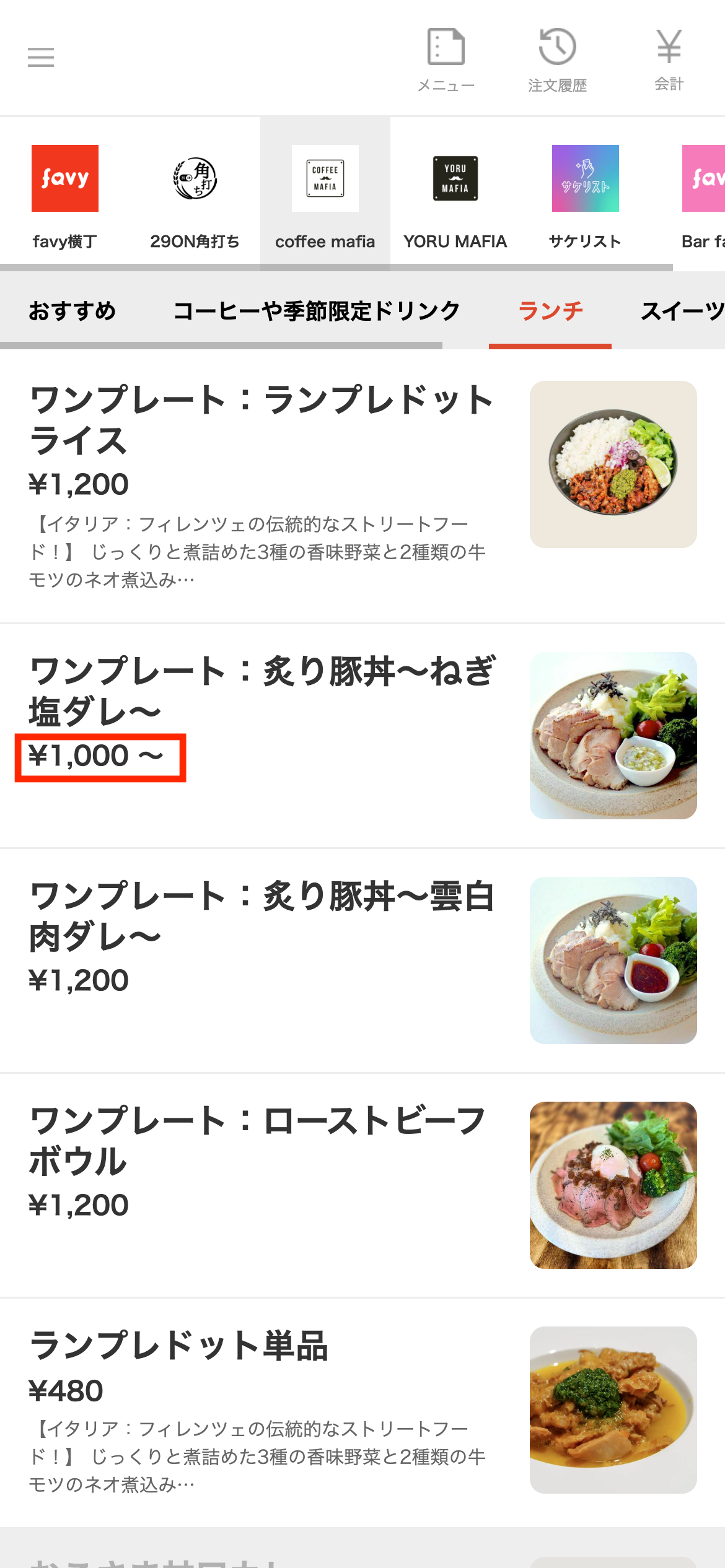 バリエーションが設定されているメニューは、メニュー一覧で価格の横に「〜」が表示されます。