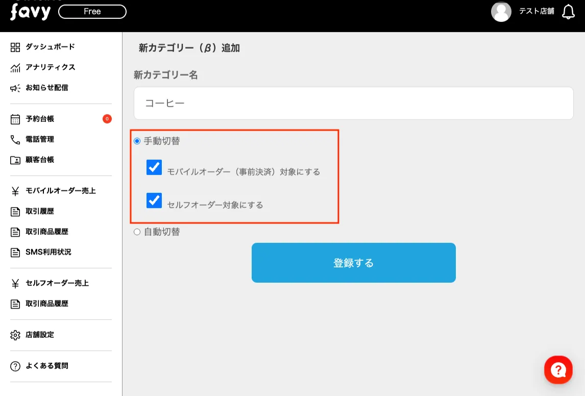 • 手動切替の場合、従来通り「プレオーダー」「セルフオーダー」の表示対象を設定できます。