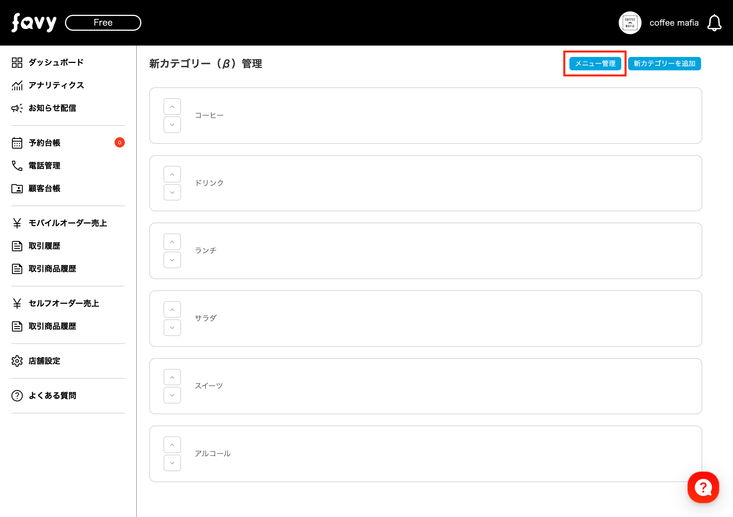 全てのカテゴリーが登録されたら、右上の「メニュー管理」を選択します。