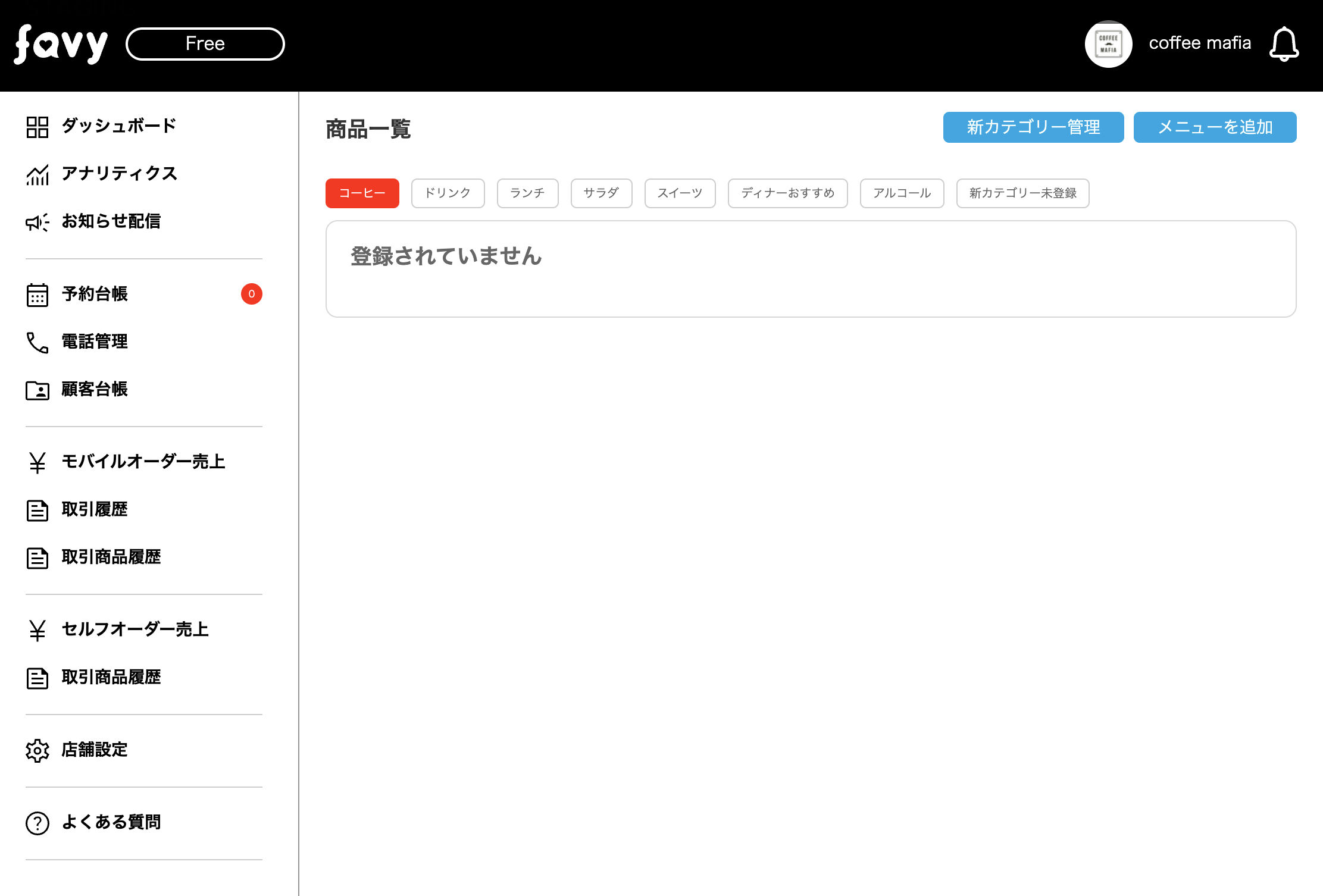 「コーヒー」にメニューが登録されました。