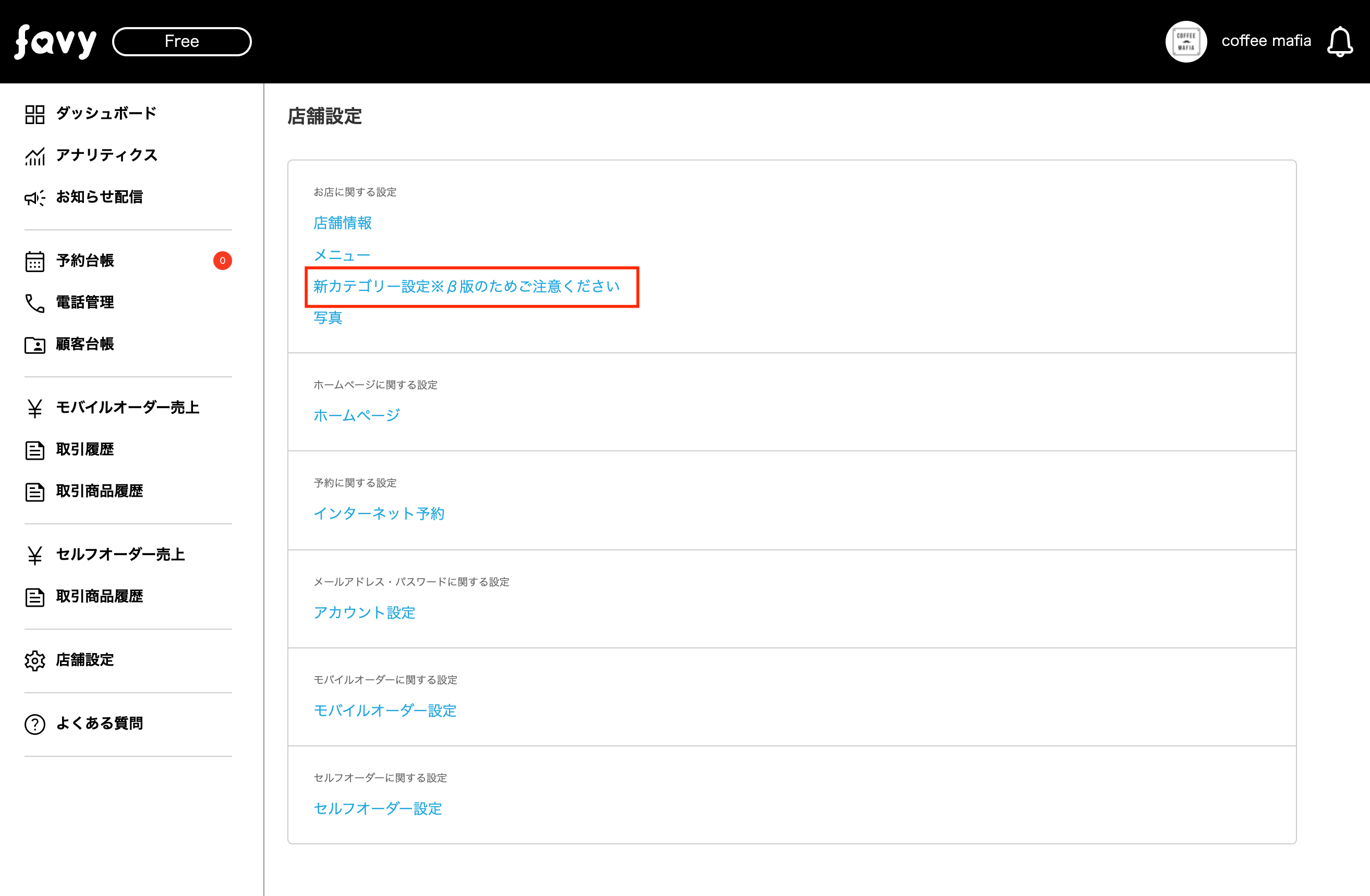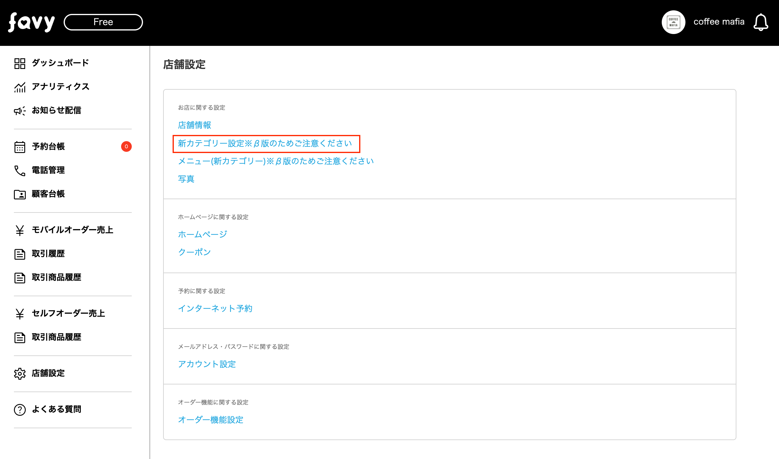 店舗設定の中の「メニュー(新カテゴリー)」を選択します