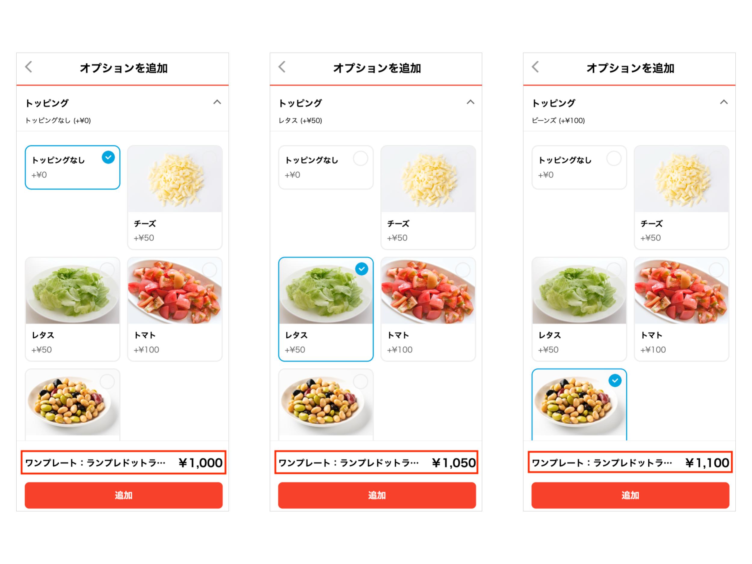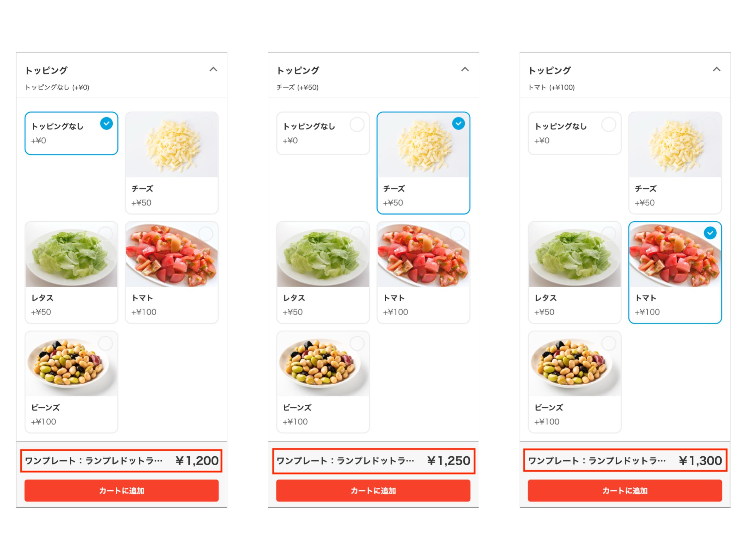 また、オプションを追加した場合の金額がカートに入れる前に表示されるようになります。