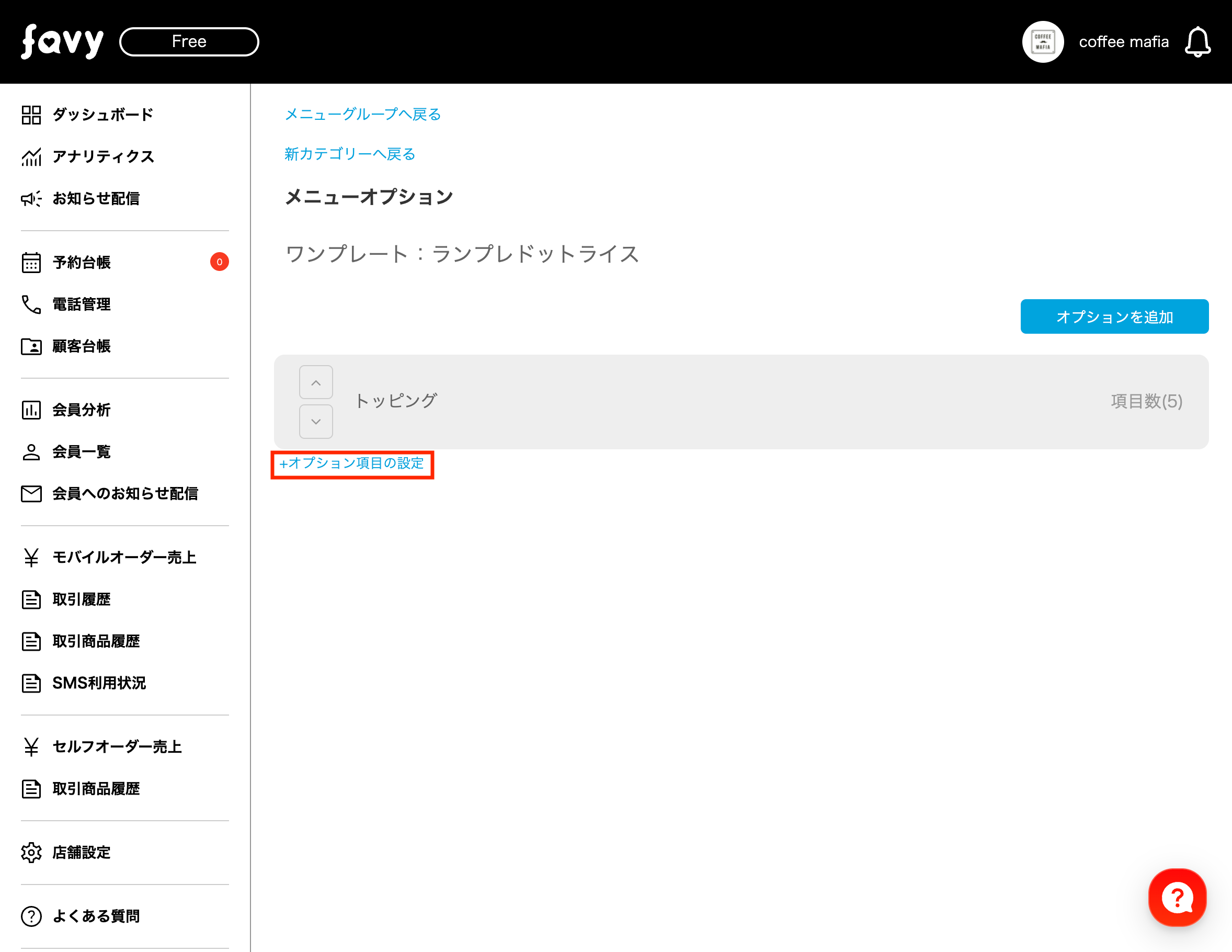 店舗管理画面の「メニュー設定」から「オプション設定」を選択