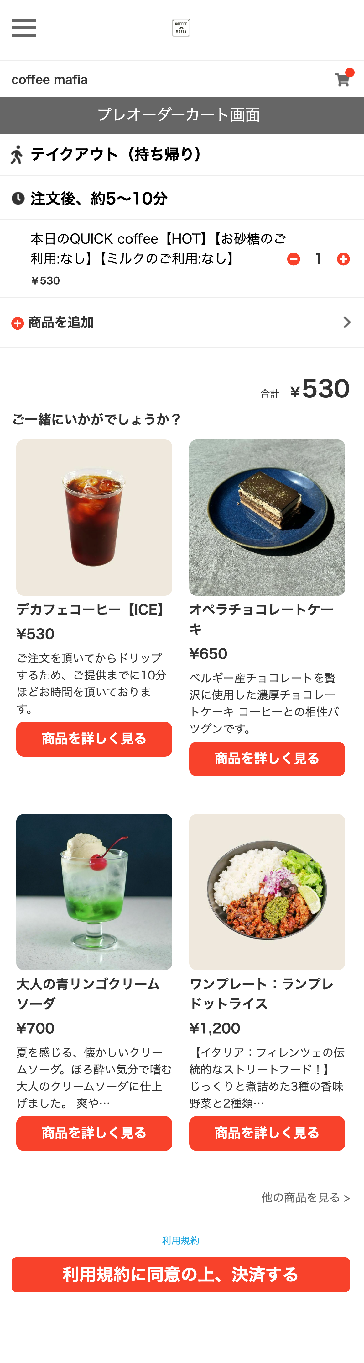 モバイルオーダー:事前決済(プレオーダー)のお客さまのカート画面に、「ご一緒にいかがでしょうか?」の文字とともに4商品が表示されるようになります。