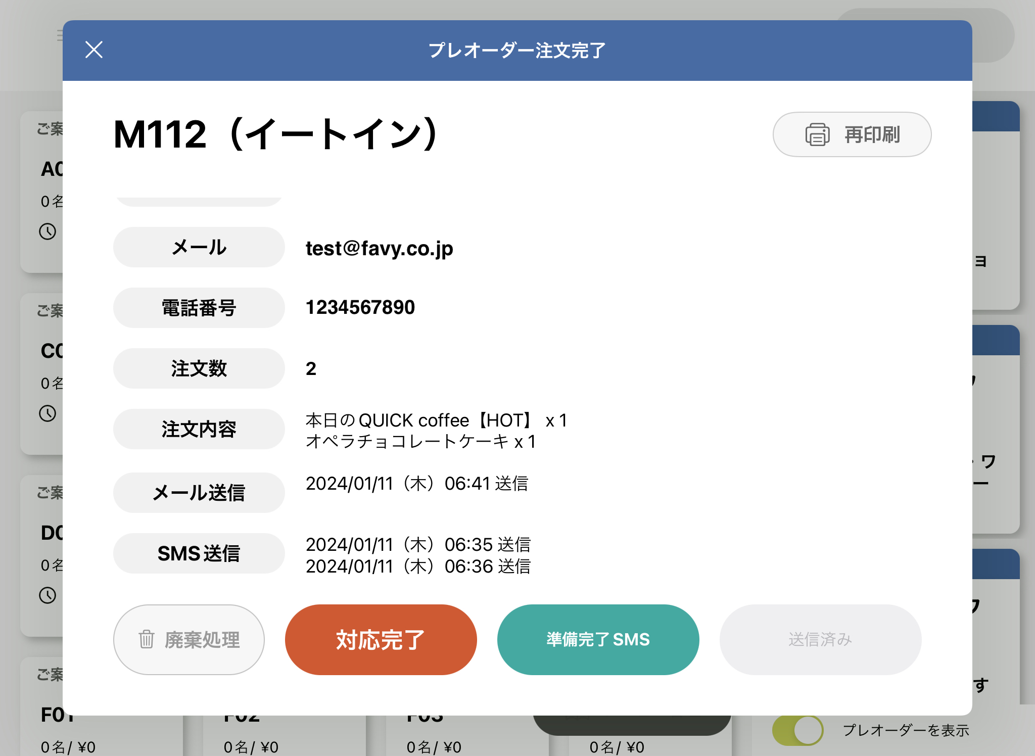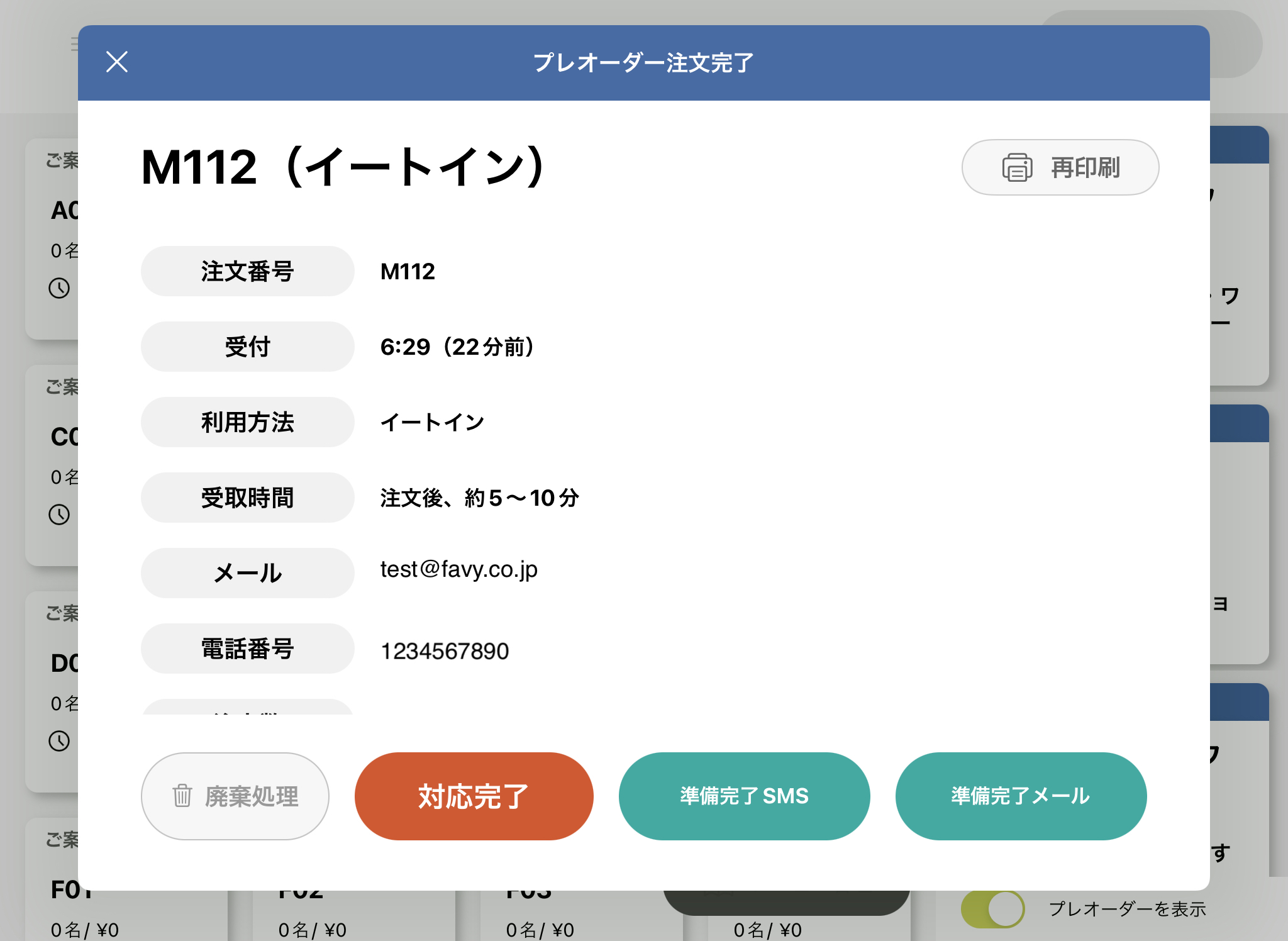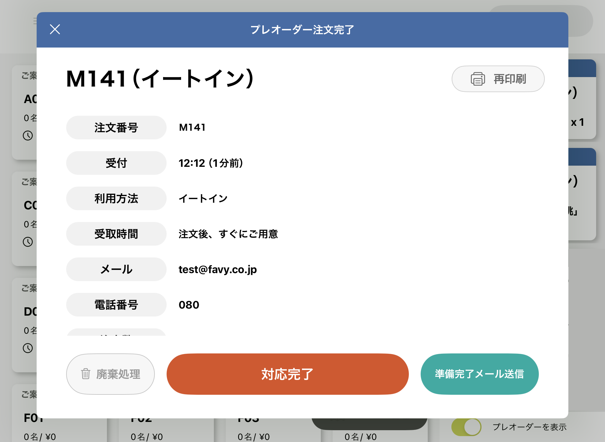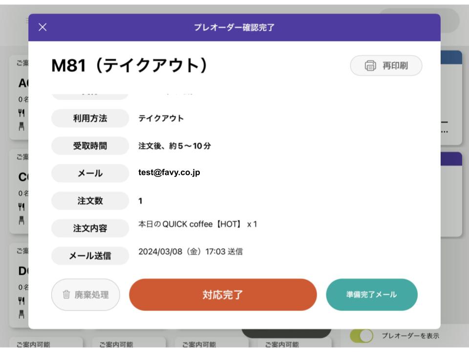 事前決済(プレオーダー)の注文が入ると右側に「プレオーダー注文完了」のチケットが表示されます。