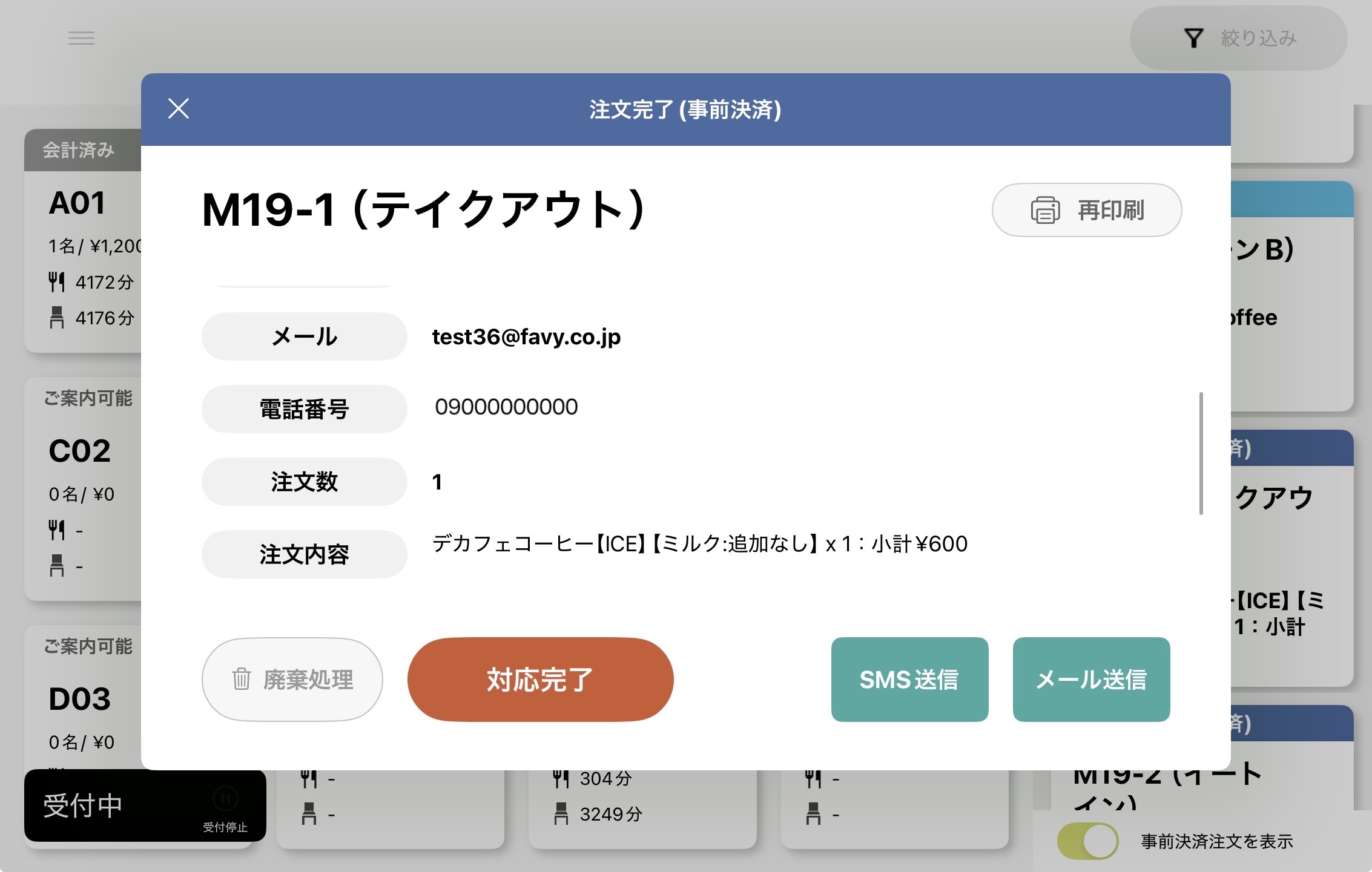 オーダーアプリからメールやSMSの準備完了通知を送っているにも関わらず、「メールが届かなかった」というお客様がいらした場合は、下記の方法でご確認・ご対応ください。