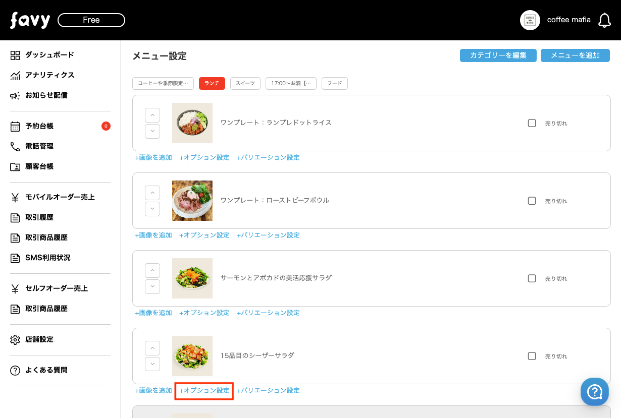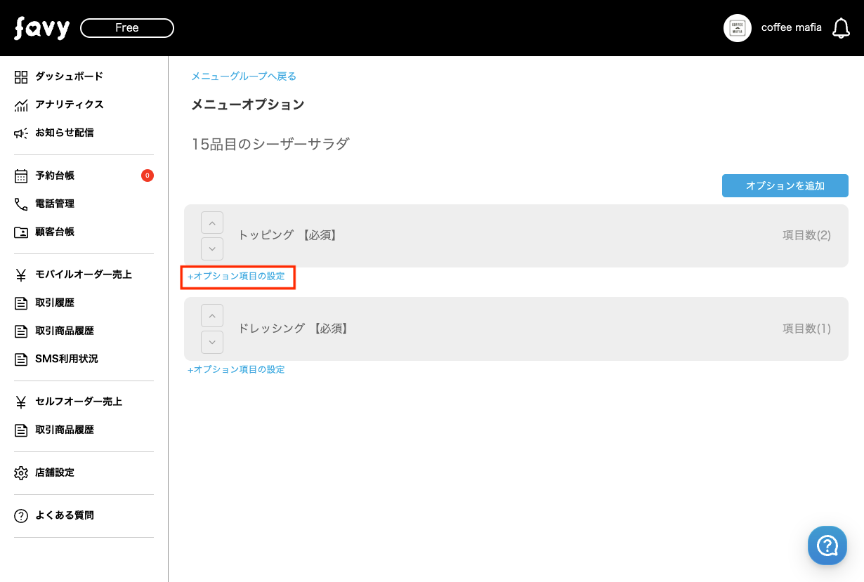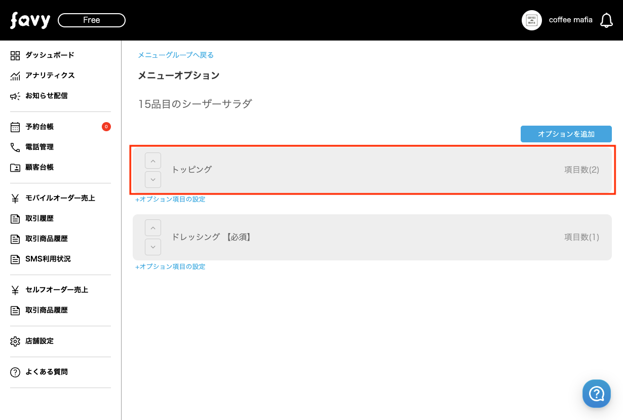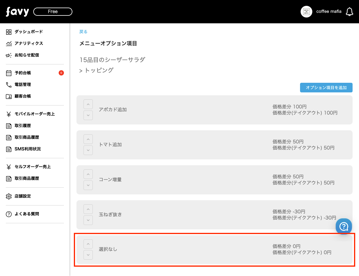 このたびfavyモバイルオーダー(事前決済・事後決済)では、メニューのオプションを「選択必須のみ」に変更となりました。