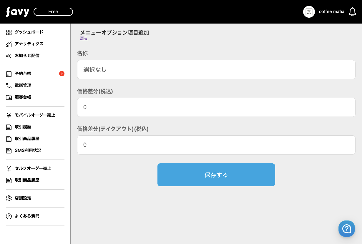 名称に「選択なし」と記載し、「価格差分(税込)」「価格差分(テイクアウト)(税込)」は0円のまま「保存する」を選択します。