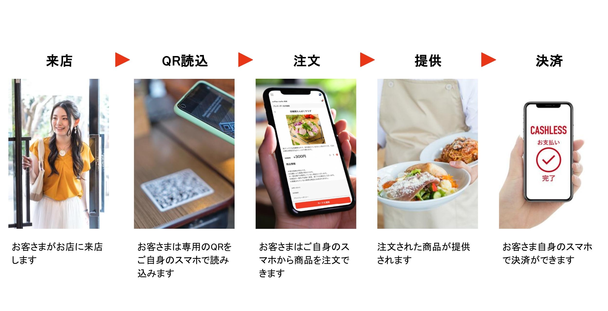 お客さまのスマートフォンからテーブルの二次元コード伝票を読み込み、メニューの確認・注文・決済ができます。