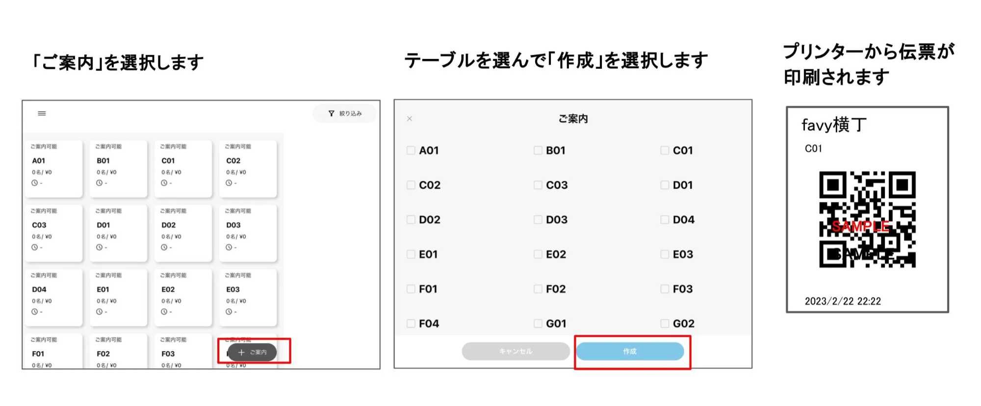 二次元コード伝票の発行、各テーブルの状況確認・修正、会計処理は「favyオーダーアプリ」の「館(フロア)ログイン」で対応します。