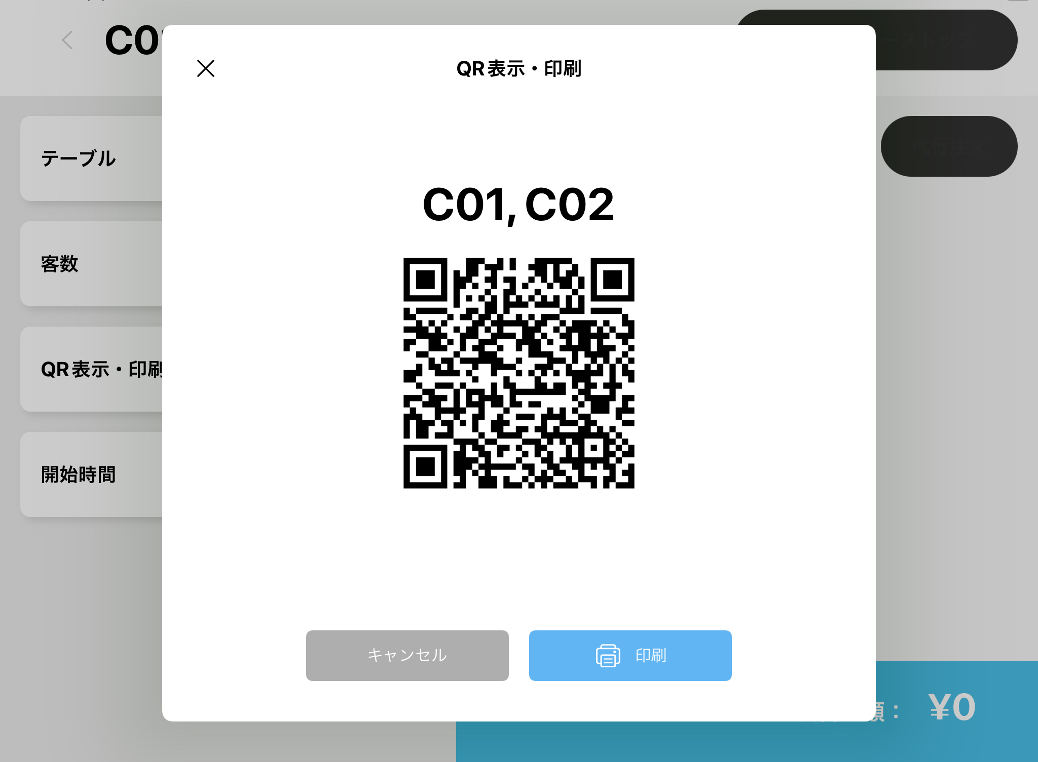 右下の「印刷」を選択すると、接続しているキッチンプリンターから二次元コード伝票が印刷されます。