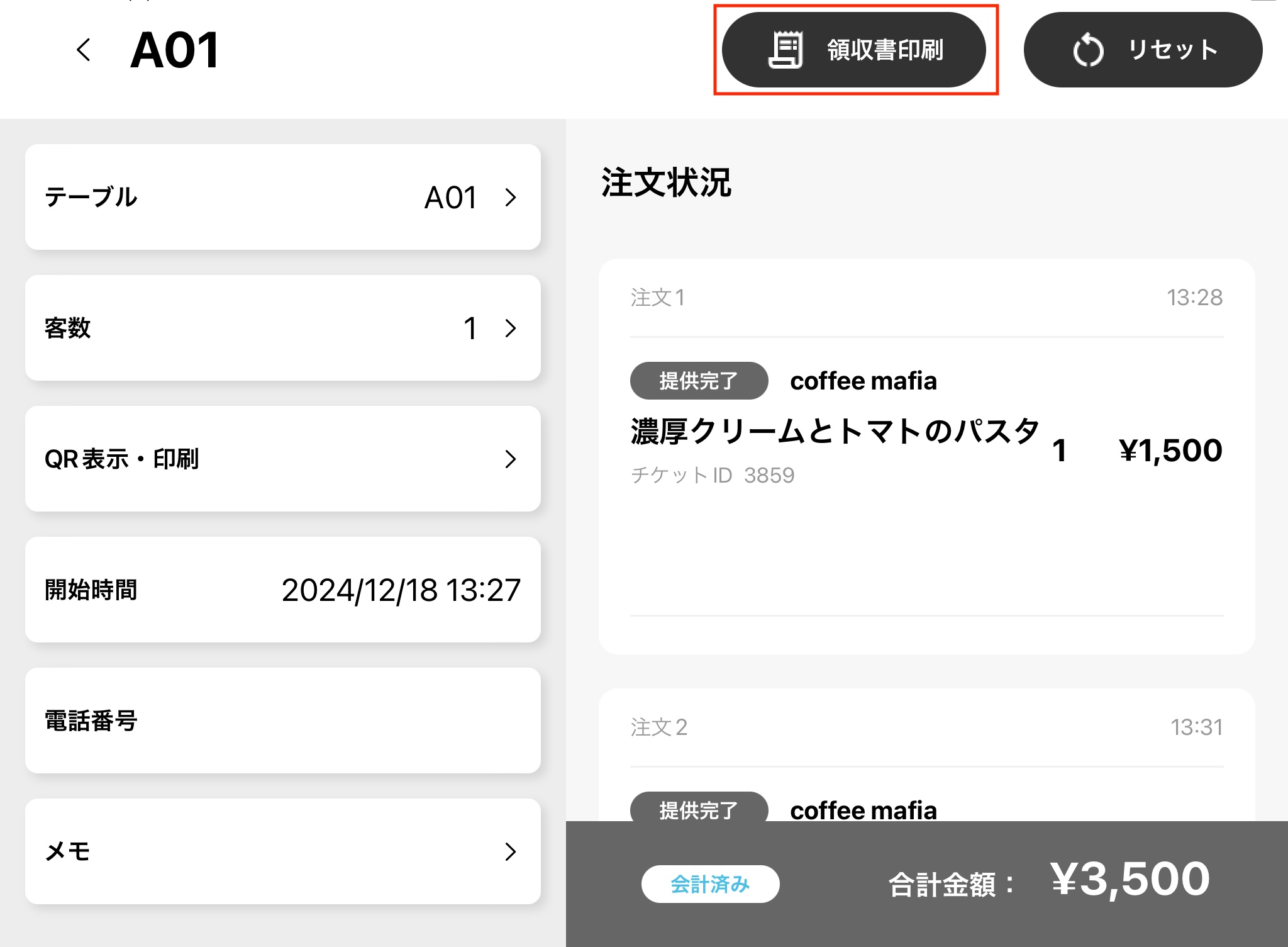 ※テーブルリセット後は領収書を印刷することができません。リセット前に操作してください。