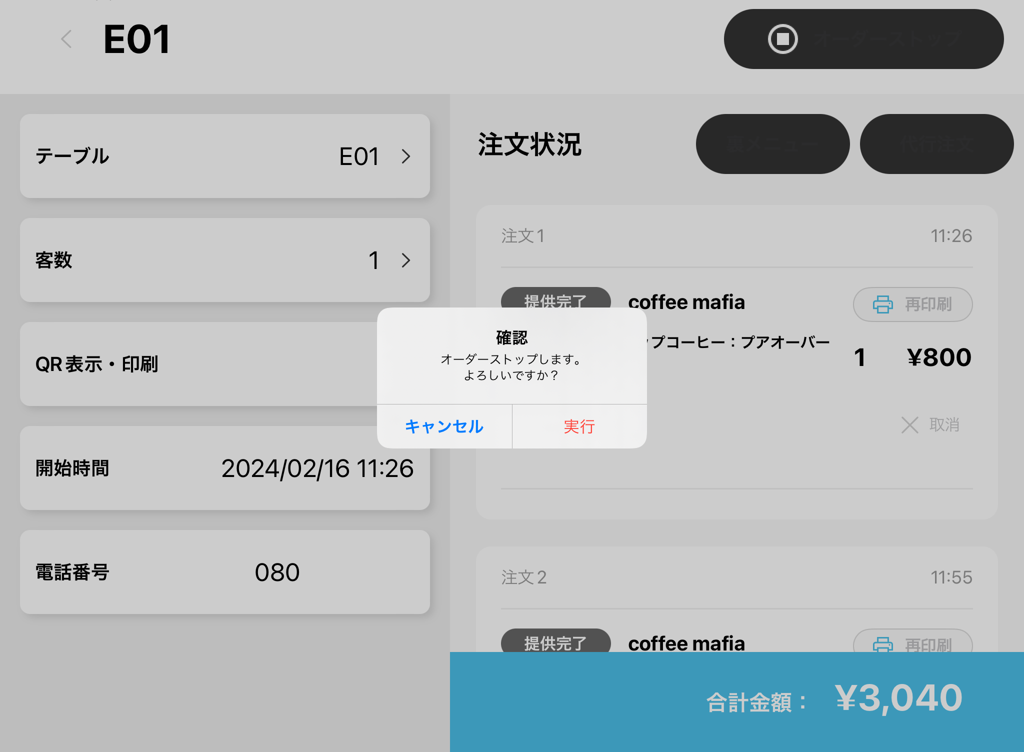 テーブル詳細画面から右上の「オーダーストップ」を選択します