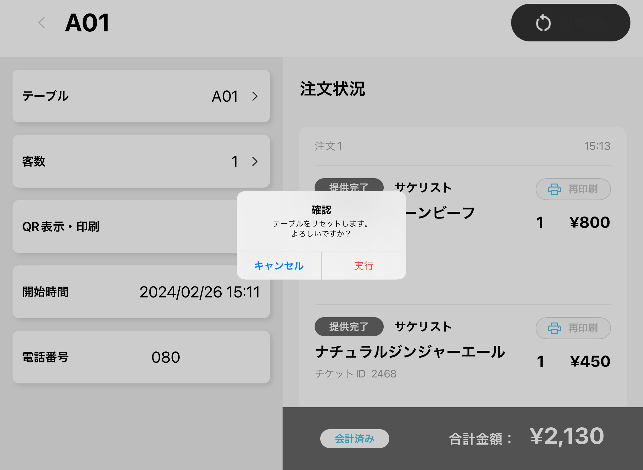 会計済みのテーブルには「リセット」のボタンが表示されます。「リセット」を選択します。