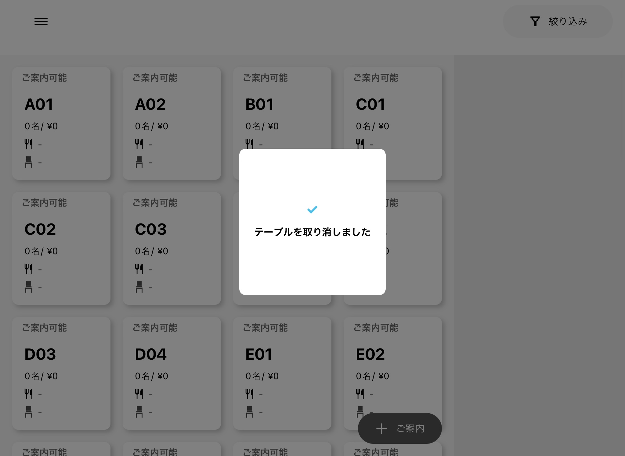 取り消したテーブルが「ご案内可能」に変わります。