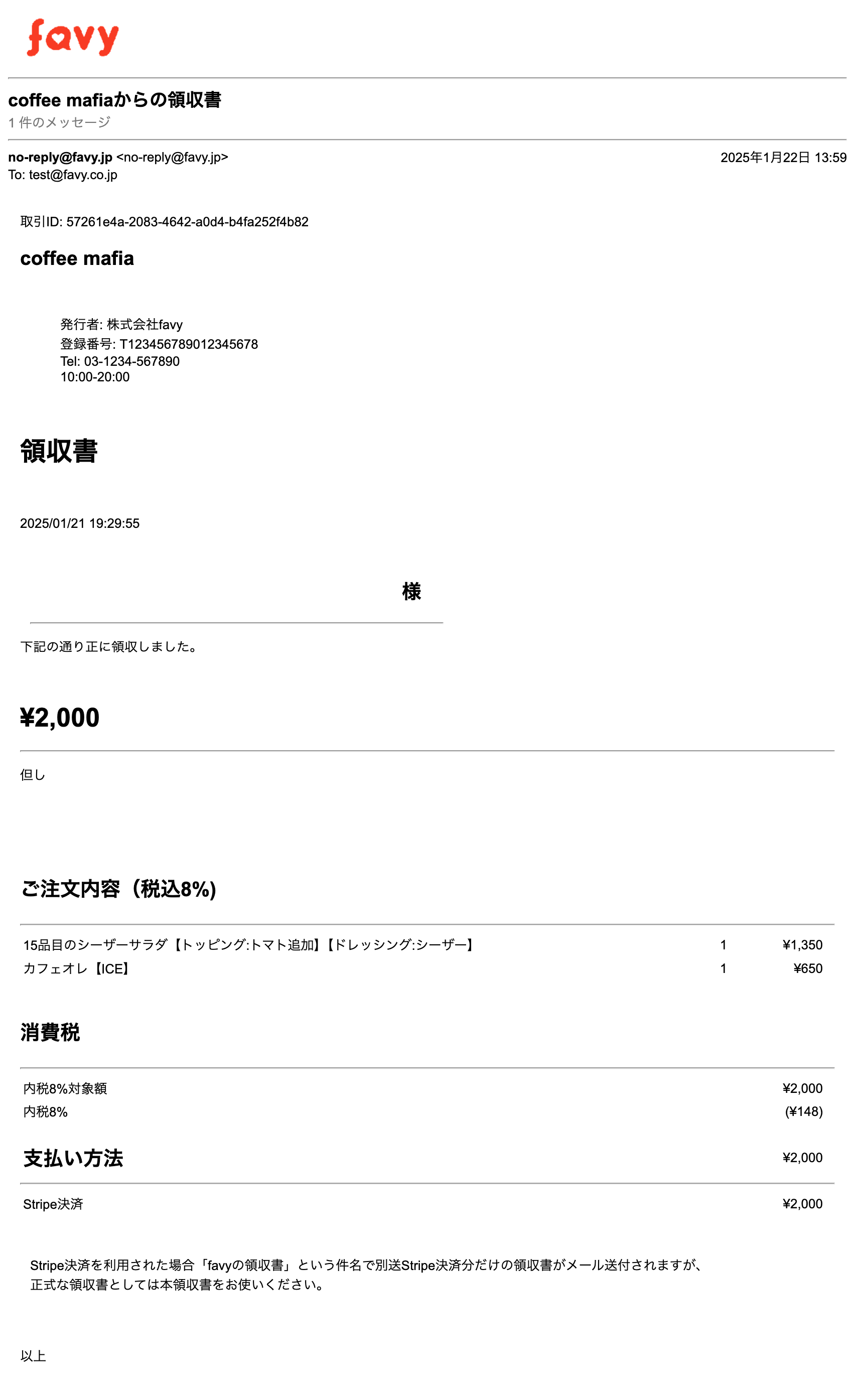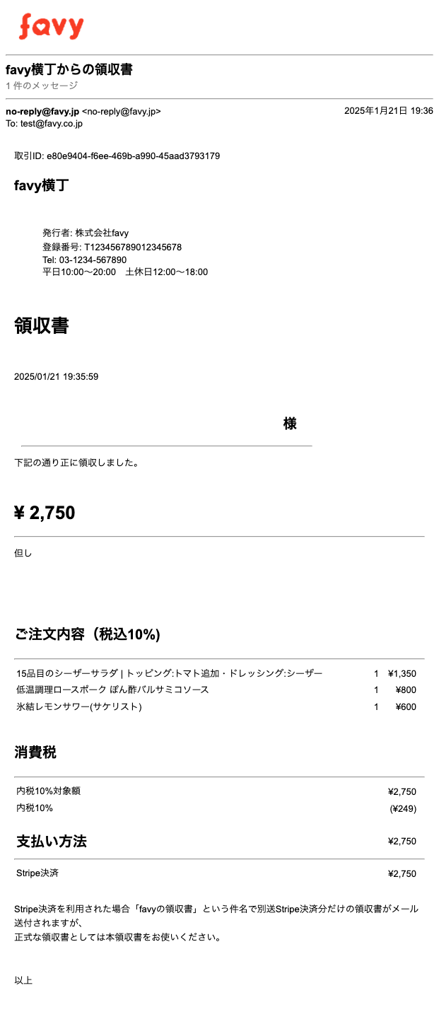 決済完了後、決済時に入力したメールアドレスに「favyの領収書」という件名でStripe決済分だけの領収書が送付されますが、正式な領収書としてはオンライン発行される領収書をお使いください。
