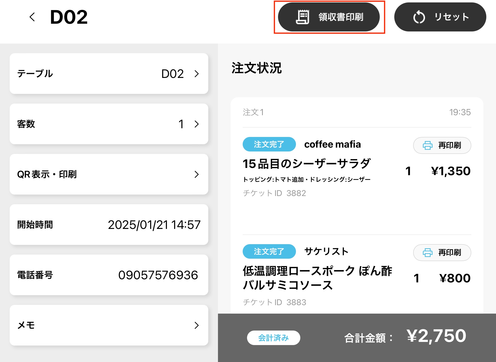 favyオーダーアプリ(館ログイン)のテーブル詳細画面から領収書を印刷することが可能です。