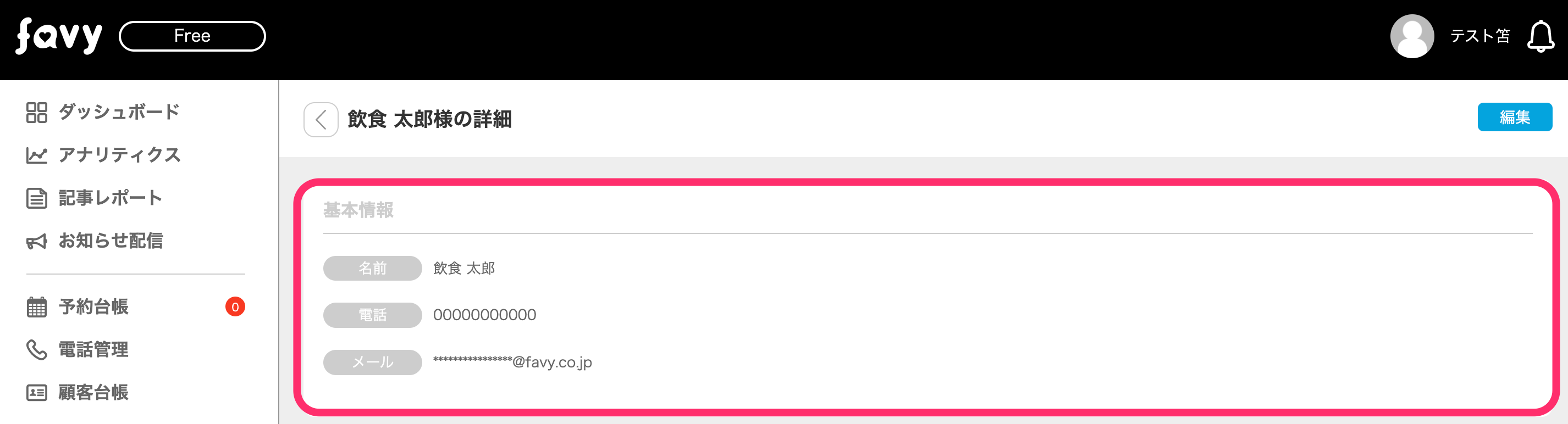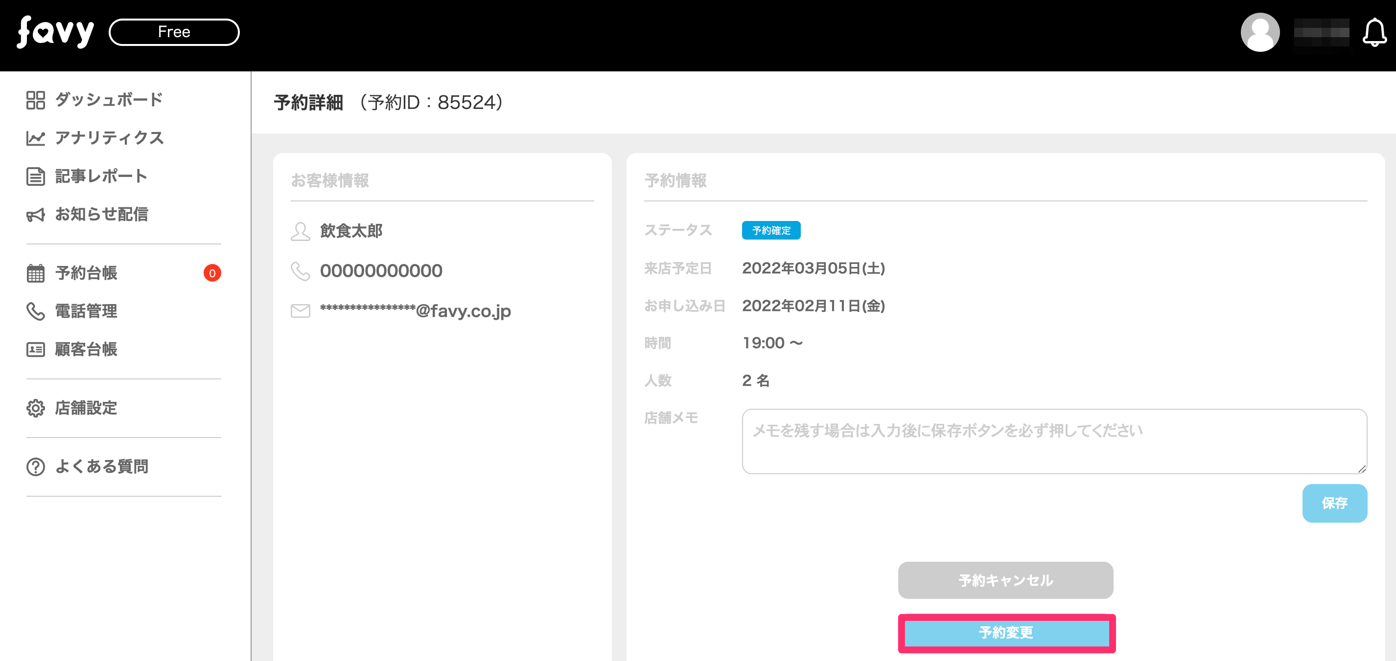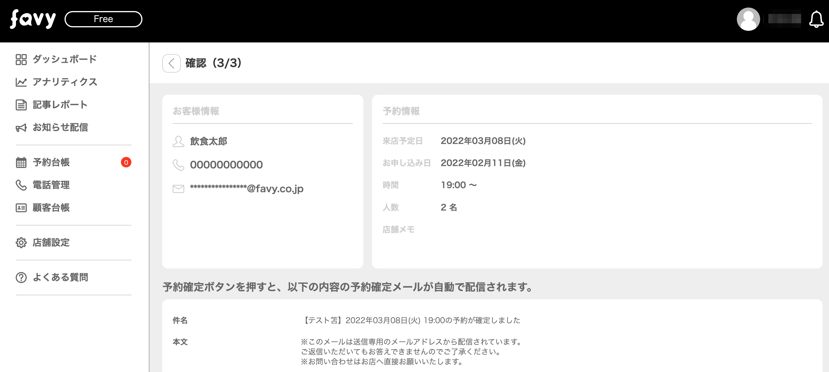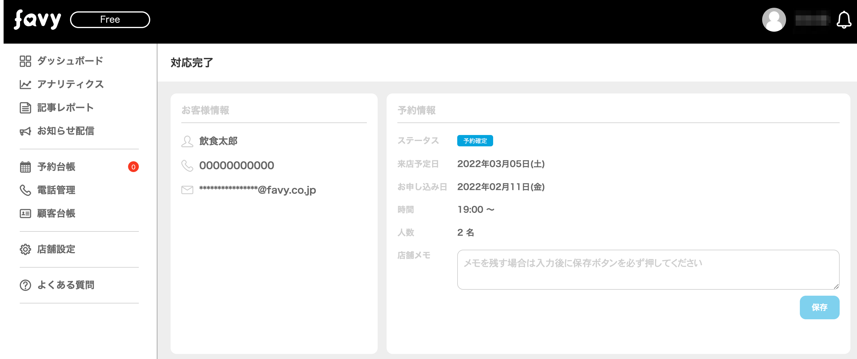 favy管理画面上の不具合を除き、万が一、予約受付に関するトラブルなどが発生しましても、弊社では責任を負うことが出来かねます。