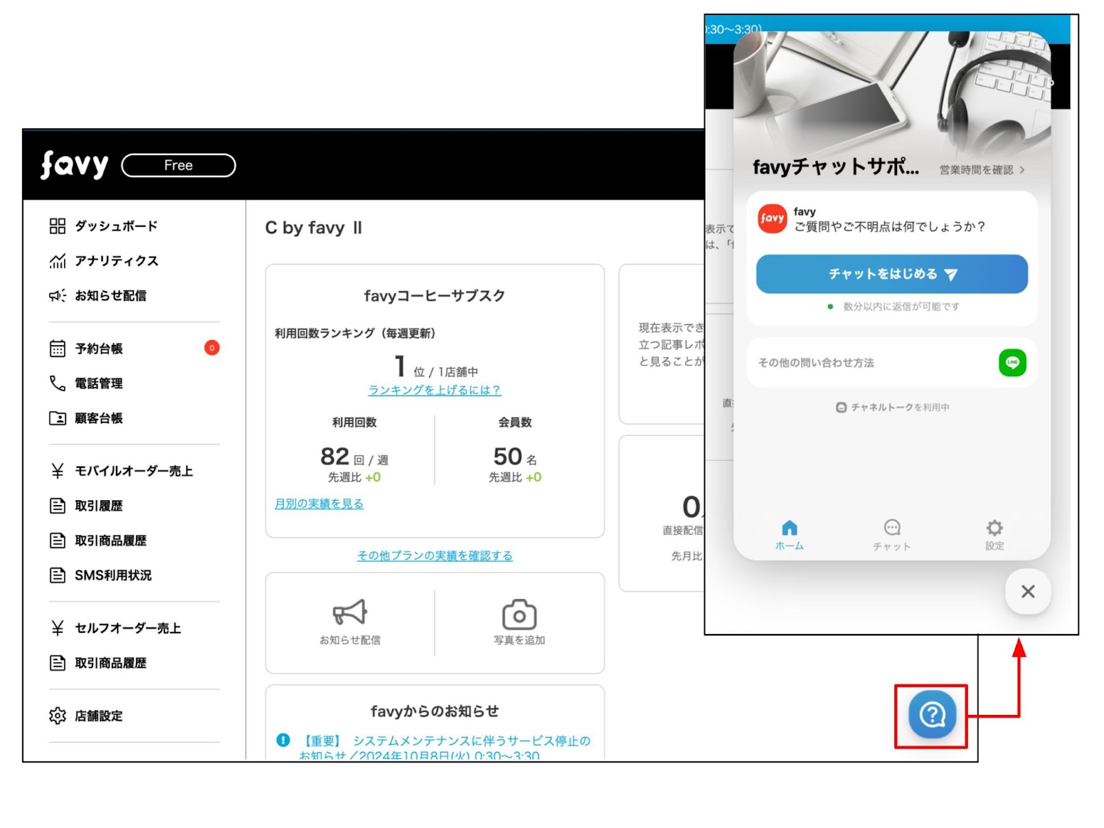 店舗管理画面右下に表示される「?」を押すと、チャットでfavyにお問い合わせができるようになりました。
