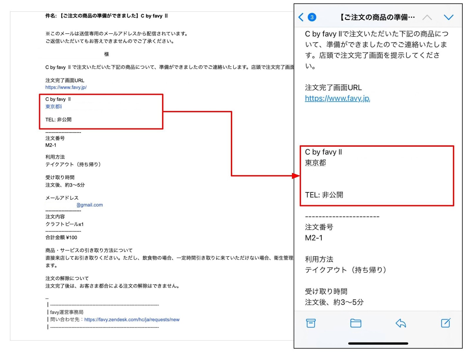 事前決済:準備完了メールのお店の電話番号欄において、非公開の場合は「非公開」の表示がされるようになりました。