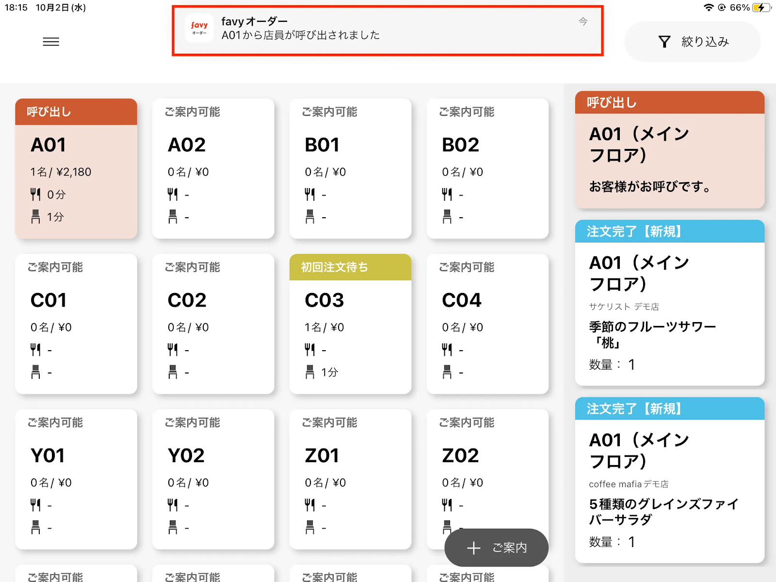 お客様からお呼び出しがあった際に、アプリ上に表示されるプッシュ通知にテーブル名が表示されるようになりました。
