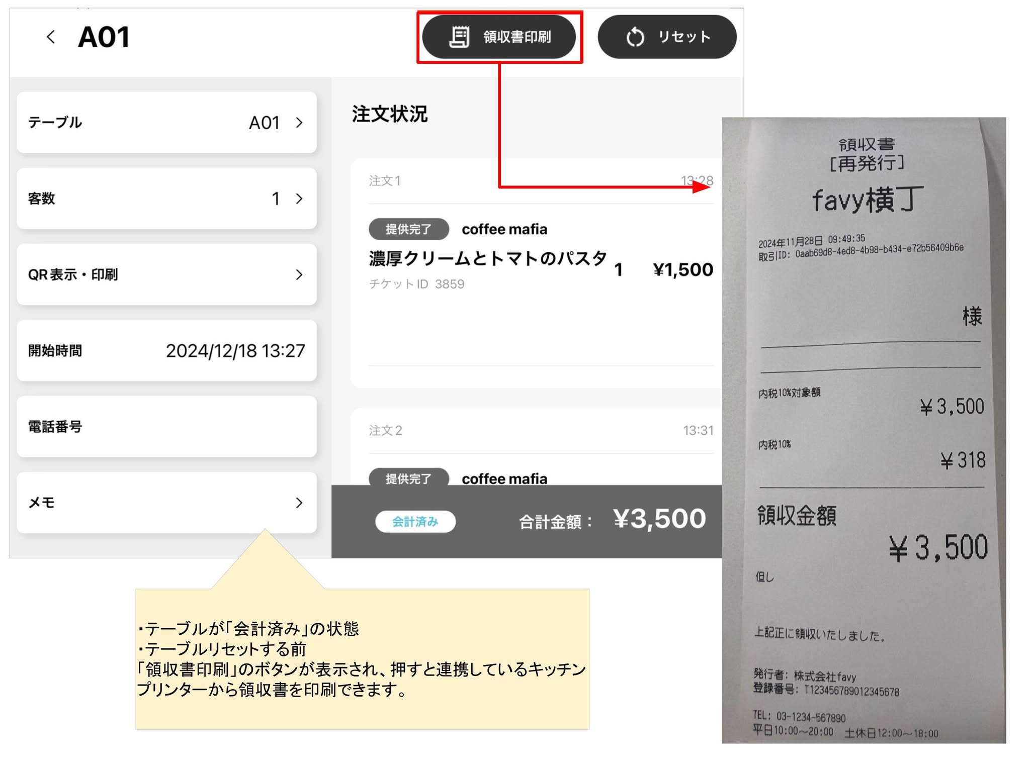 テーブルが会計済みの状態でテーブルリセット前であれば発行可能です。※正式な領収書はお客様の決済完了画面からオンラインで発行される領収書です。キッチンプリンターから発行される領収書には最初から「再発行」と記載されています。