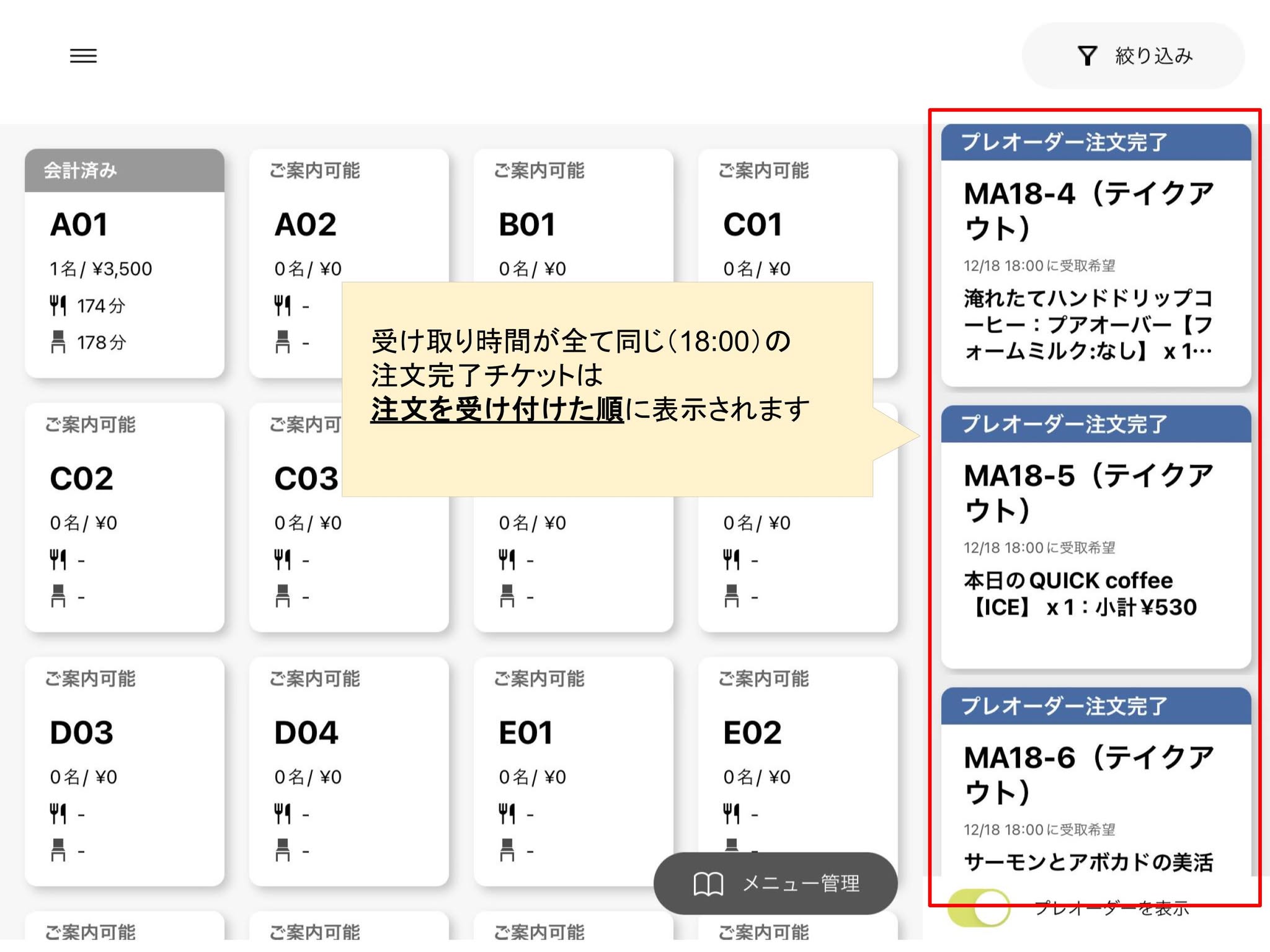 事前決済の注文完了チケットは、受け取り時間設定を「店舗側の指定時刻以降」「顧客が受け取り時間を指定」にしている場合は受け取り日時順に表示されていますが、受け取り日時が全く同じ場合には、注文を受け付けた順(決済された順)で表示されるように修正されました。