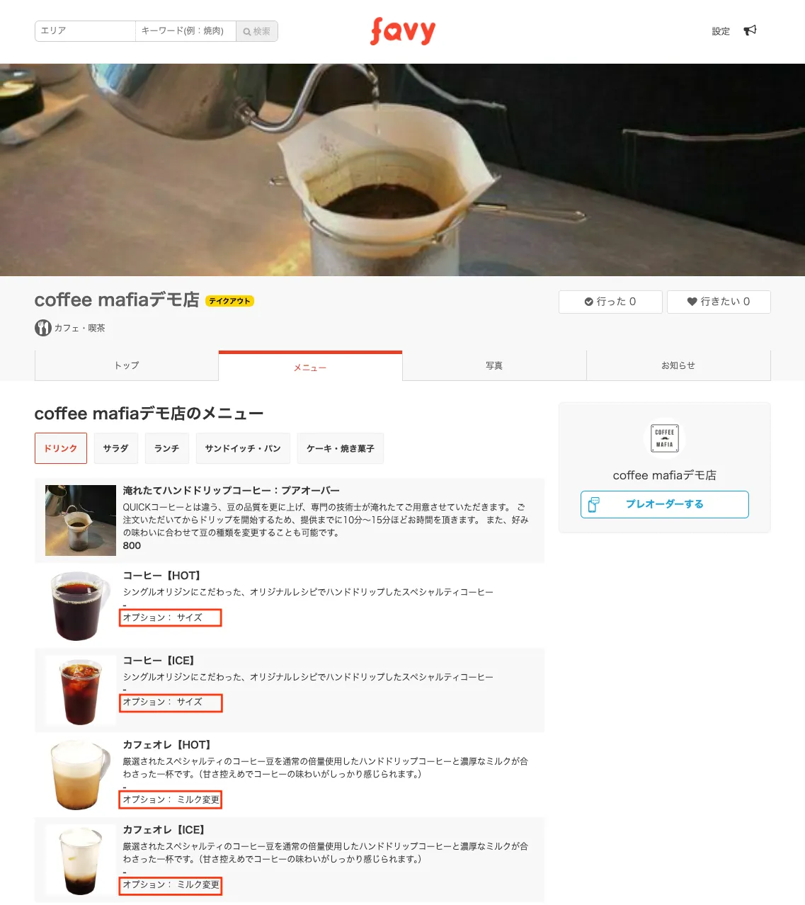 【favyお店ページ】内のメニューにオプション名が表示されるようになりました。
