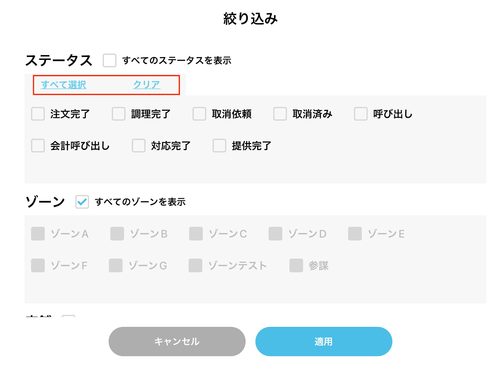 絞り込み画面に「すべて選択」「クリア」が追加され、項目選択がしやすくなりました。