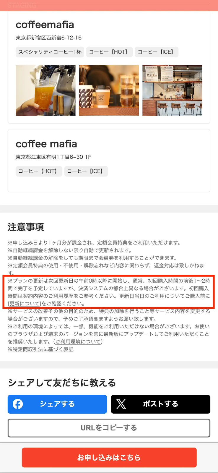 「プランの更新は次回更新日の午前0時以降に開始し、通常、初回購入時間の前後1〜2時間で完了を予定していますが、決済システムの都合上異なる場合がございます。初回購入時間は契約内容のご利用履歴をご参考ください。更新日当日のご利用についてご購入前に[更新について]をご確認ください。」