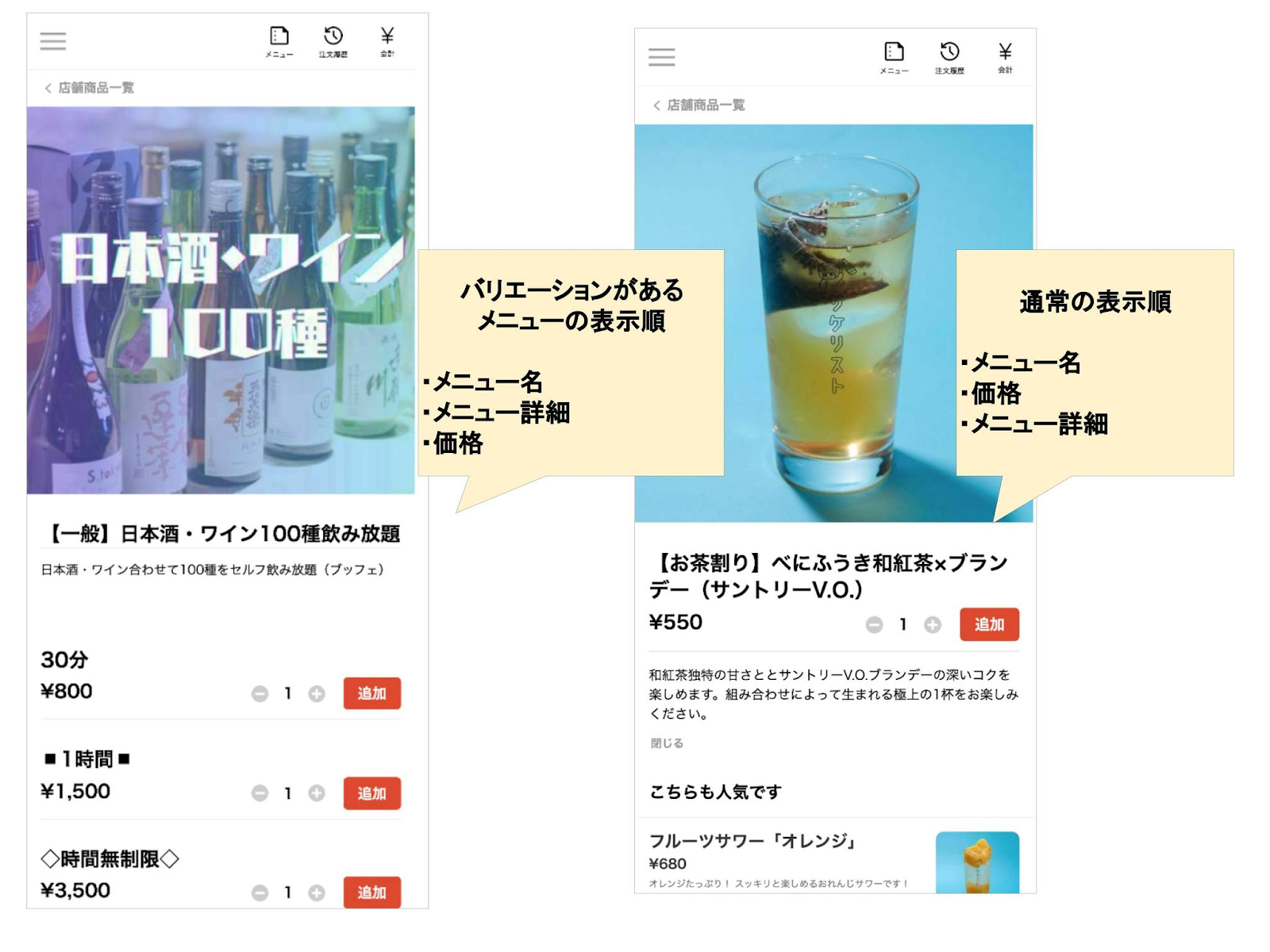 これまでのメニュー画面では、画像の下に「価格→メニュー詳細の文言」の順で表示されていました。「バリエーションが複数ある場合、どんなメニューか分かりづらい」とのご意見がありましたため、バリエーションが設定されているメニューについては、「メニュー詳細の文言→価格」の順で表示されるようになりました。