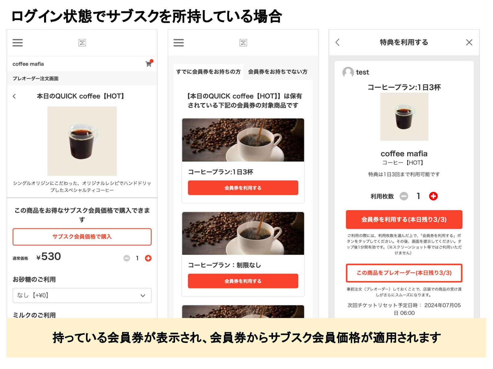 お客様画面:モバイルオーダー(事前決済型)注文時にサブスク会員価格を適用する動線を修正しました
