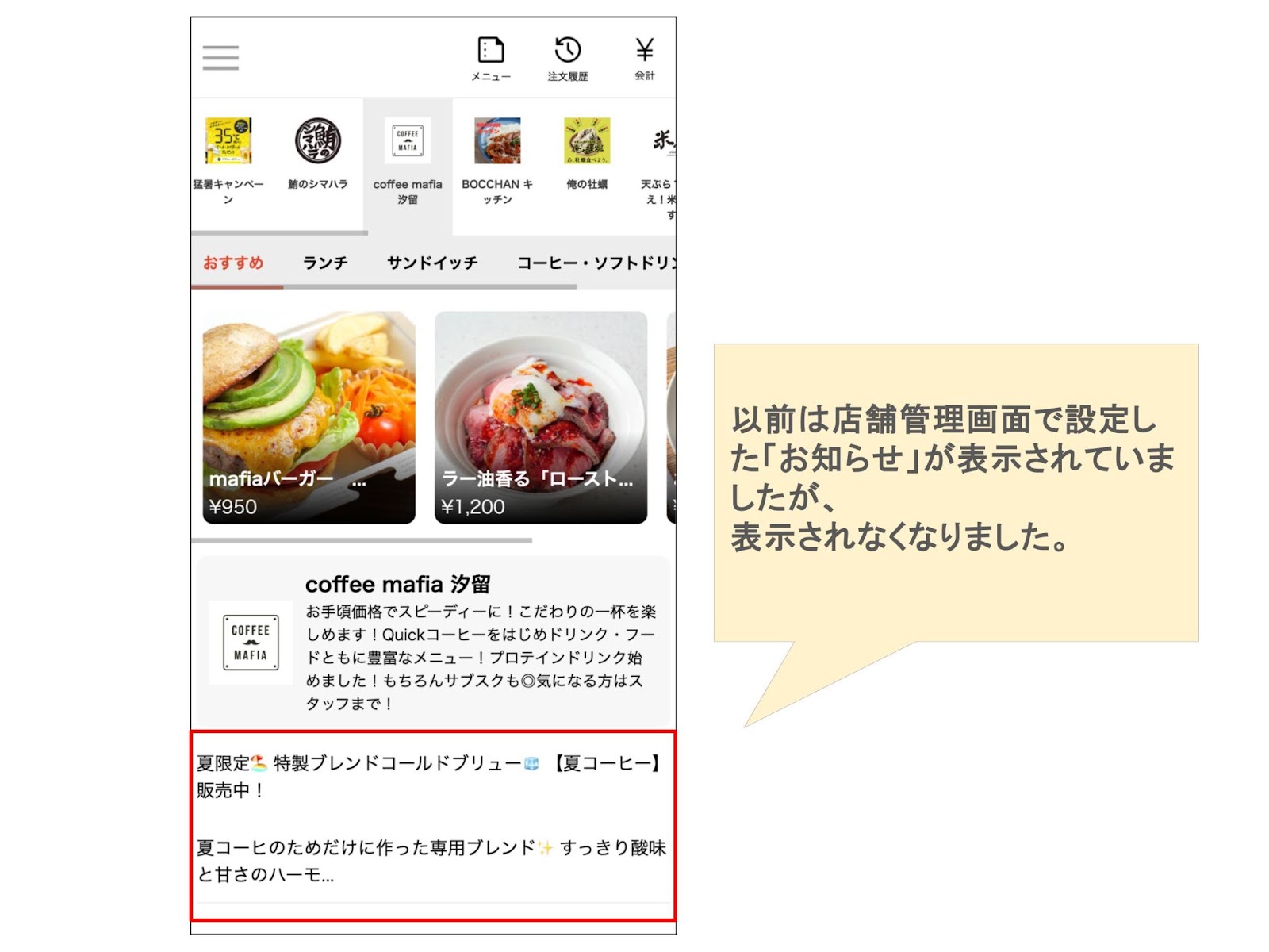 事後決済型:モバイルオーダー(事後決済)のお客様画面には、ホームページの「お知らせ」が表示されなくなりました