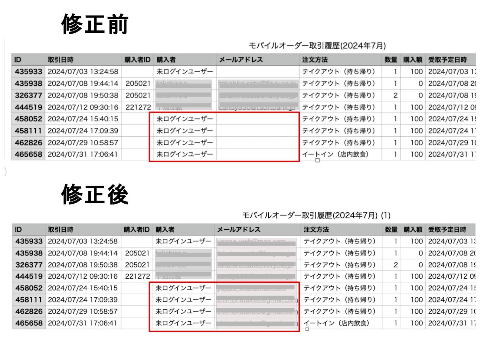 【モバイルオーダー取引履歴】で「未ログインユーザー」のメールアドレスが表示されるようになりました