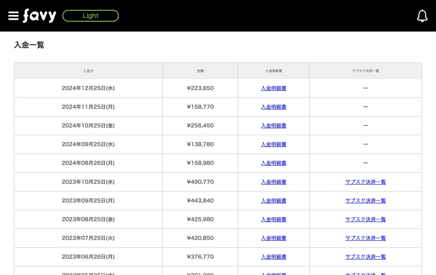 ※店舗管理画面の入金一覧は、ご契約内容(契約プラン・精算方法)によって店舗管理画面に表示されていない場合がございます。