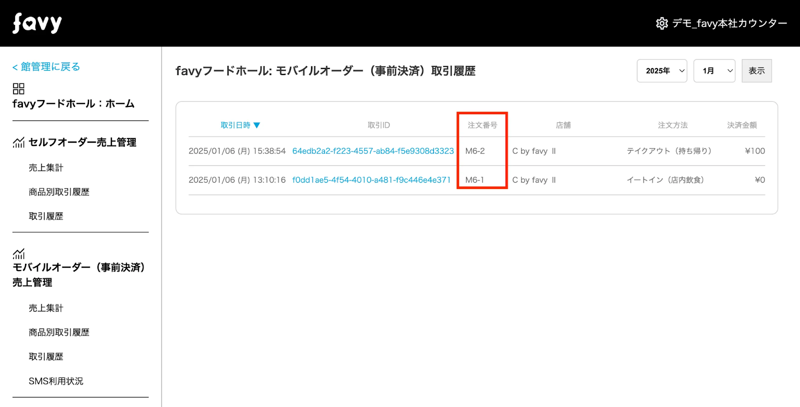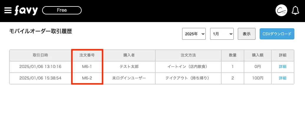 館管理画面・店舗管理画面上で、モバイルオーダー(事前決済)の取引履歴画面に注文番号(M12など)が表示されるようになりました。