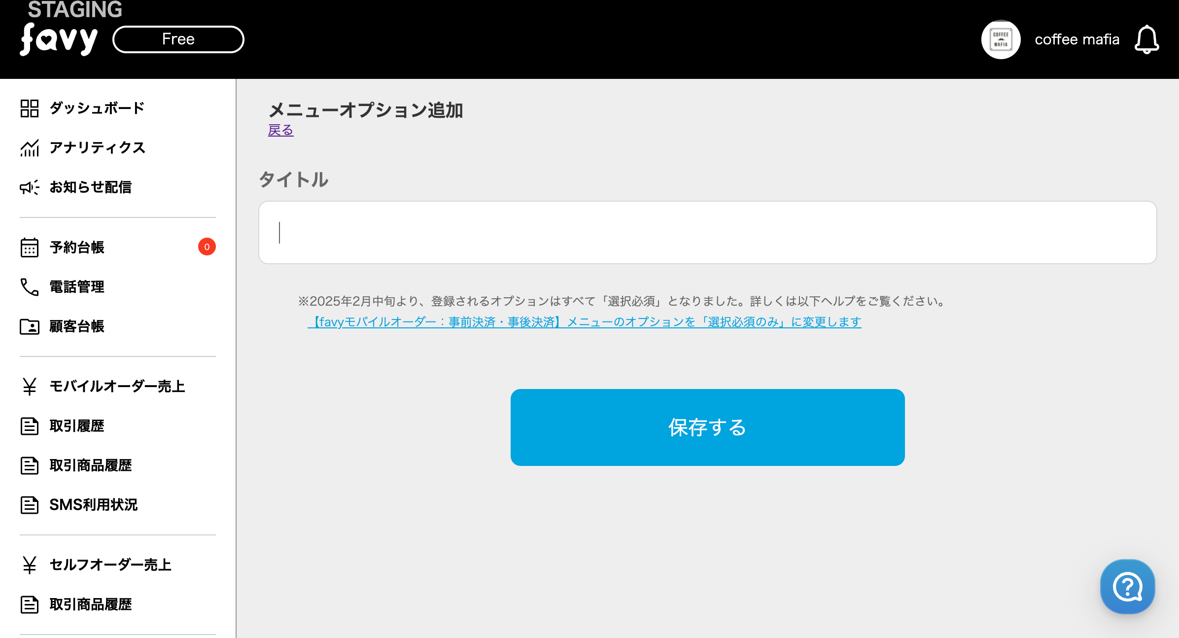 favyモバイルオーダー(事前決済・事後決済)では、メニューのオプションを「選択必須のみ」に変更となりました。