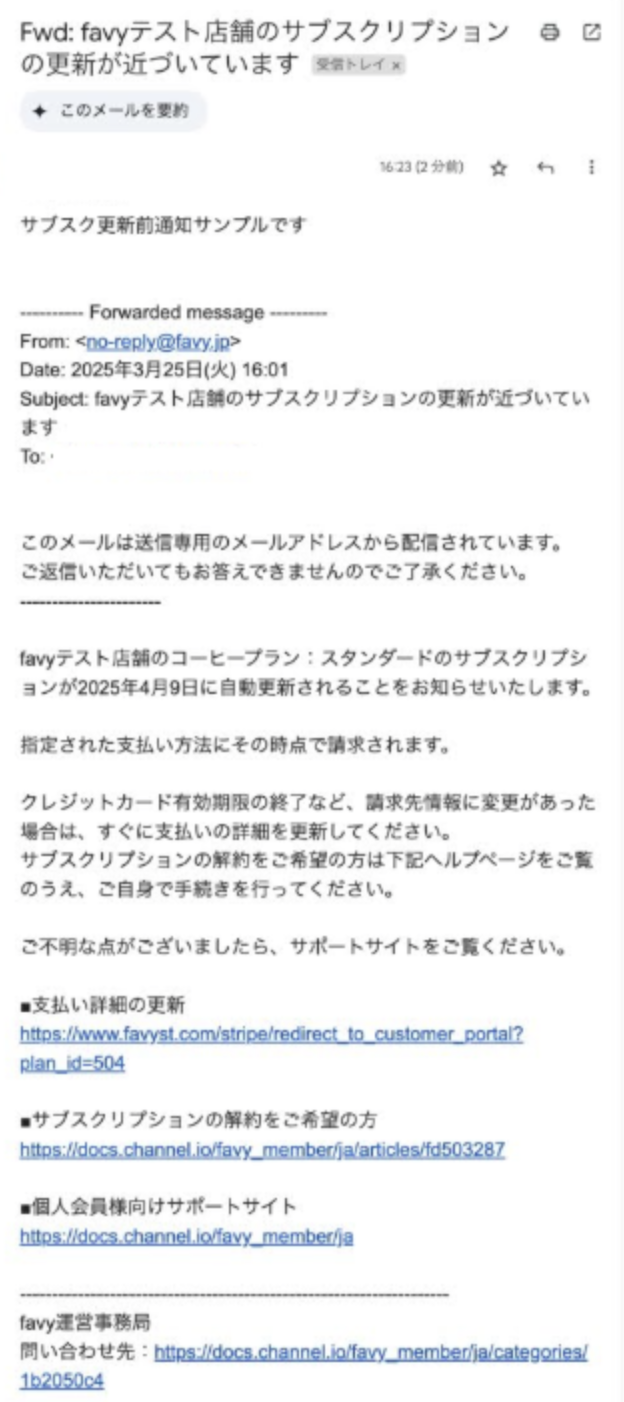 お客様からいただいたお声を元に、サブスク会員券の更新7日前に、更新予定を通知するメールを自動送信する機能を追加いたしました。