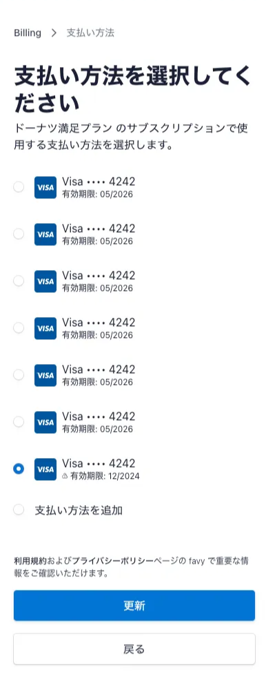 更新前告知メール内に記載の「支払い詳細の更新」をクリックし、favyアカウントにログインすると、クレジットカードの切り替えができるようになりました。