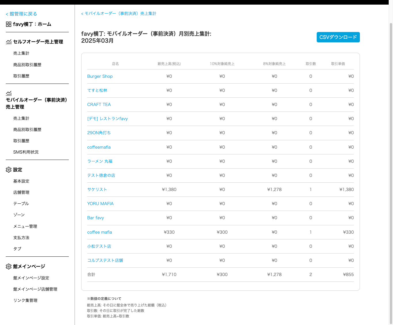 モバイルオーダー(事前決済)に関連する企業管理画面において、これまでは数値の表示のみでしたが、2箇所にCSVダウンロードボタンを追加しました。