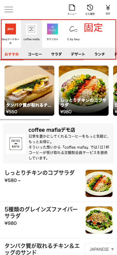 来店客がメニュー・商品を閲覧している一覧画面において、店舗別のタブがスクロールに応じて自動的に出し入れされるようになりました。