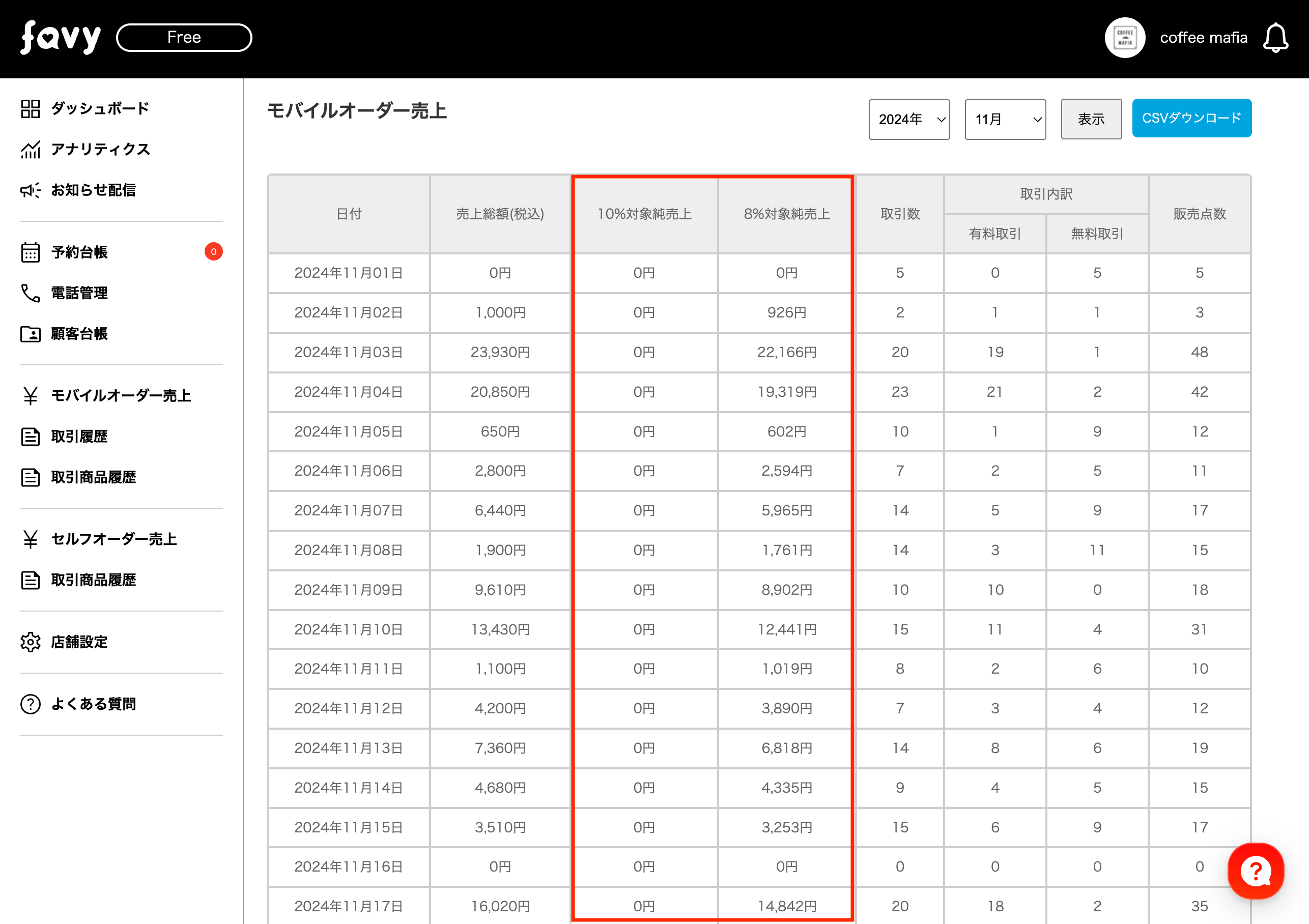 店舗管理画面の「モバイルオーダー売上」画面に「8%対象純売上」「10%対象純売上」が表示されるようになりました。