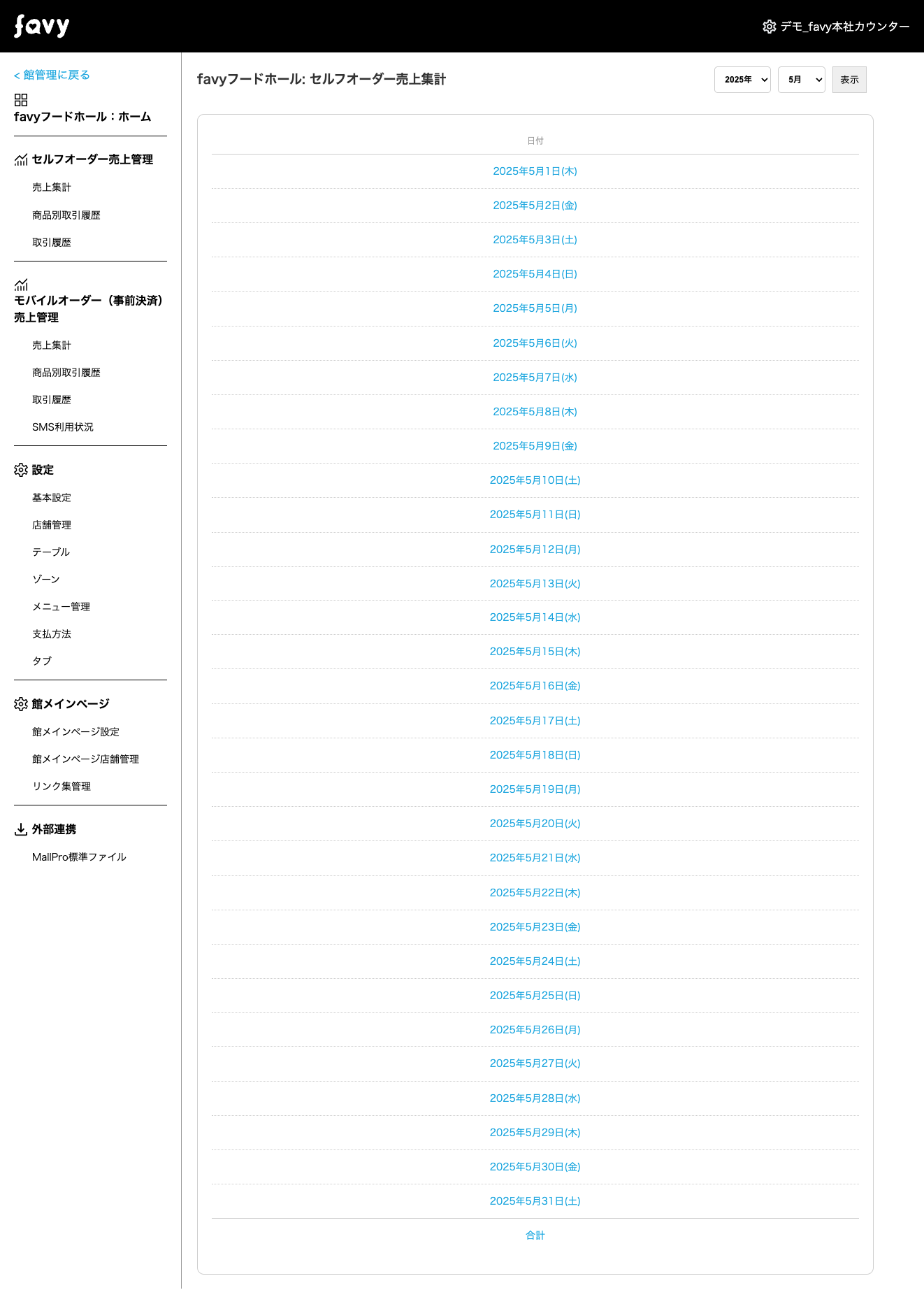 館管理画面のモバイルオーダー(事前決済・事後決済)売上集計ページにおいて、一覧表示ではなく日付を選択した先でデータを確認するよう修正されました。