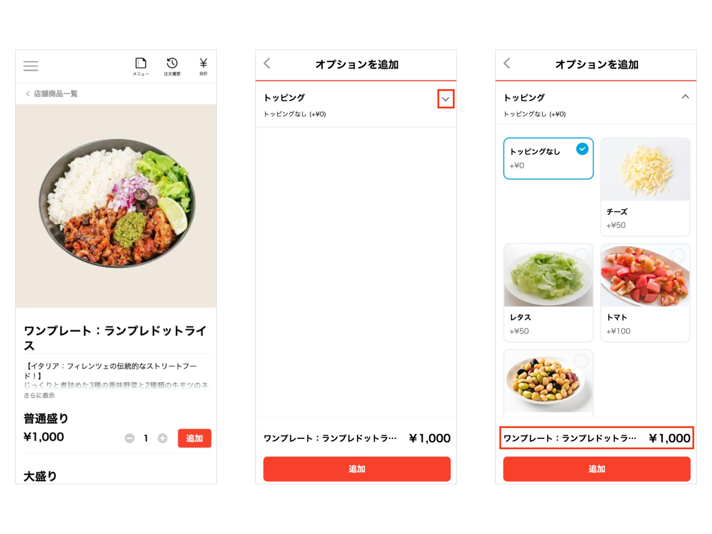 モバイルオーダー(事前決済・事後決済)のお客様画面でメニューのオプションを追加した場合の金額がカートに入れる前に表示されるようになりました。